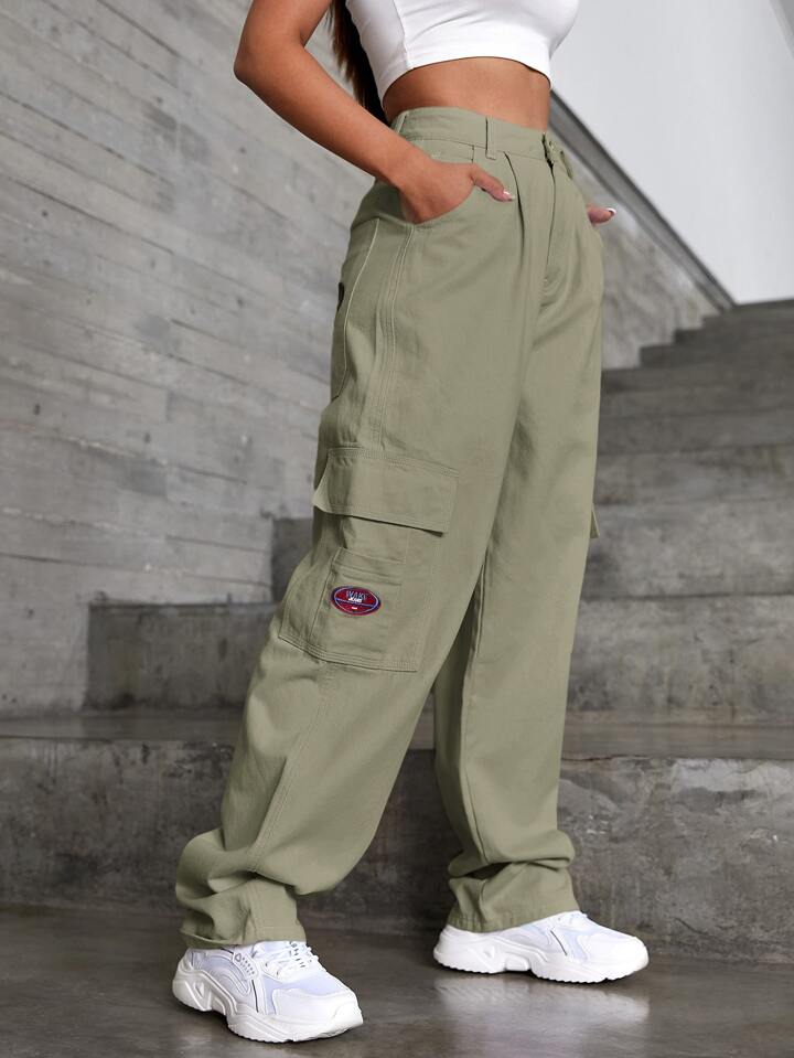 Patched Detail Flap Pocket Wide Leg Jeans
