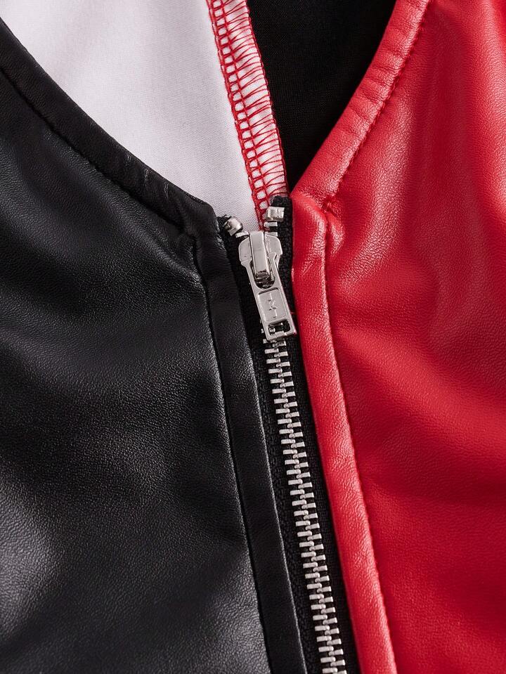 Patched Detail Zip Up PU Leather Costume Vest Jacket