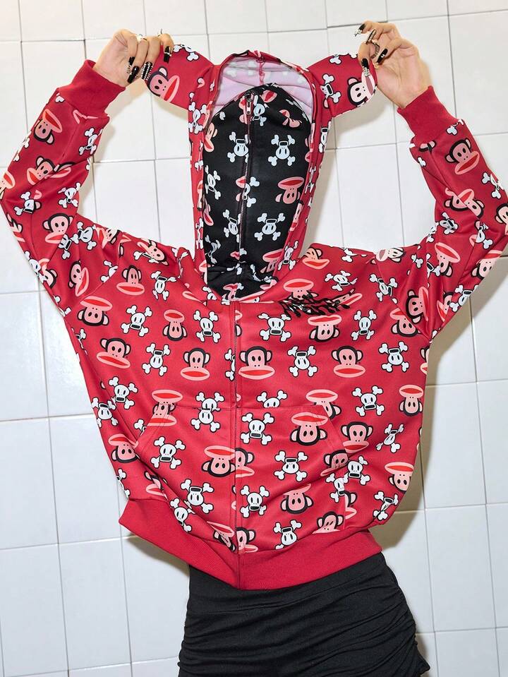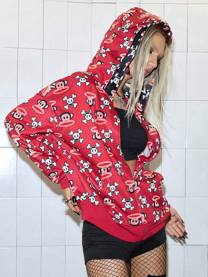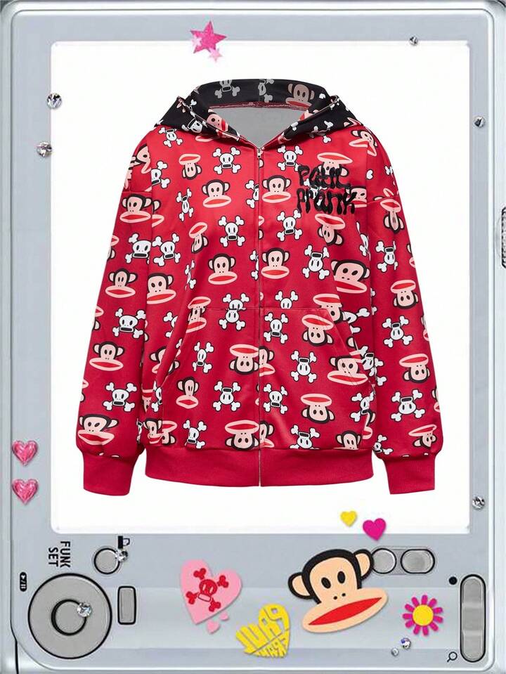 Paul Frank X ROMWE All-Over Print Colorblock Oversized Hoodie Jacket With Cute Ears For Women