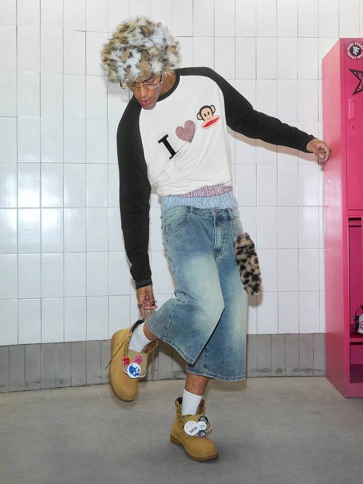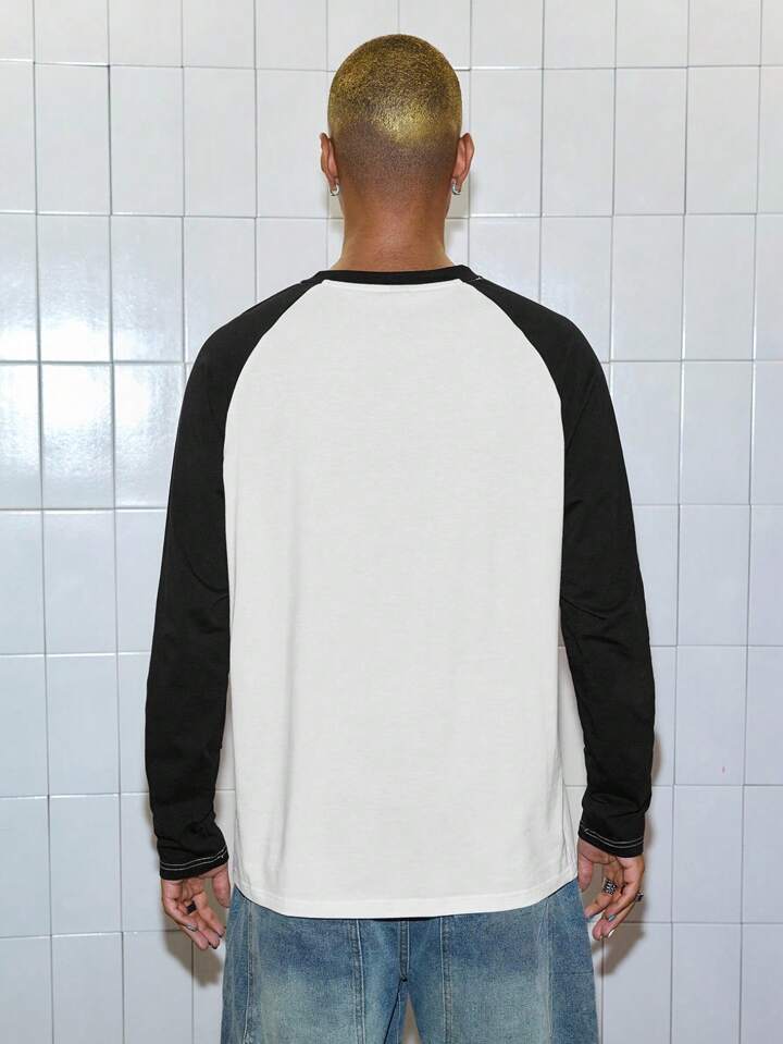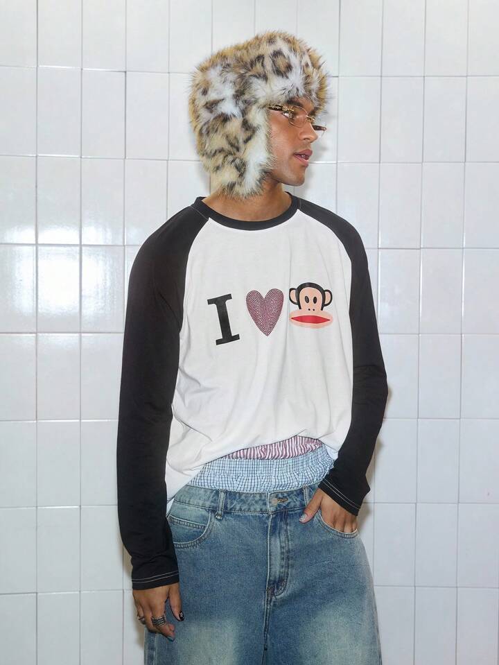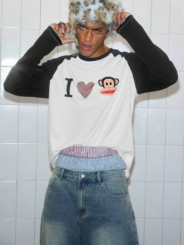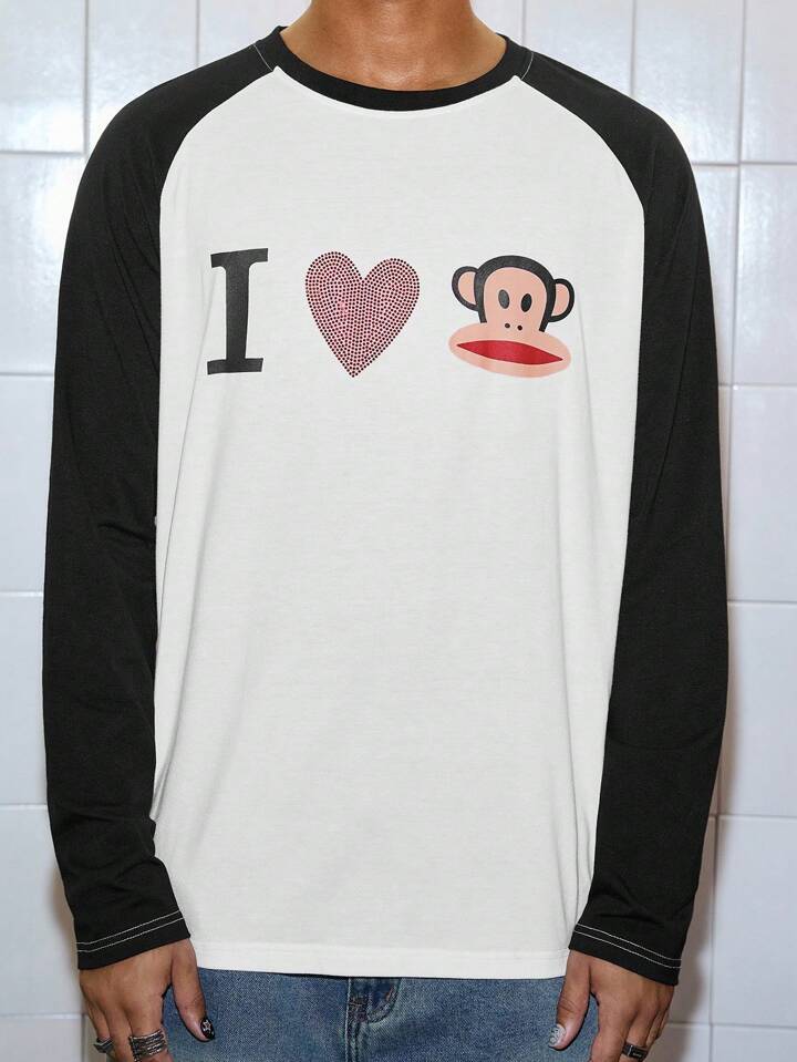Paul Frank X ROMWE Men KPOP Rhinestone Detail Letter Cartoon Pattern Contrast Raglan Long Sleeve T-Shirt, Fall, 2000s Style