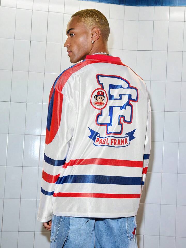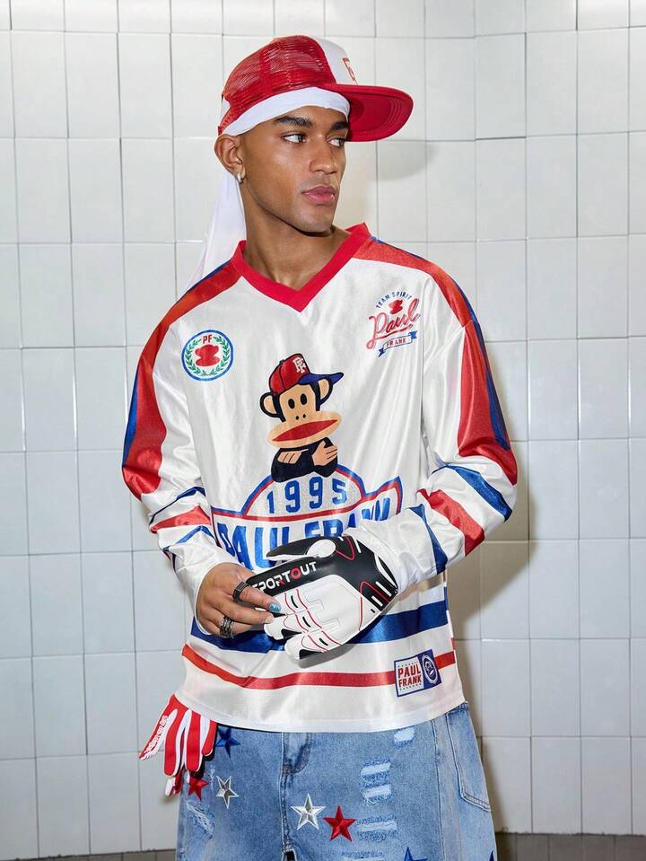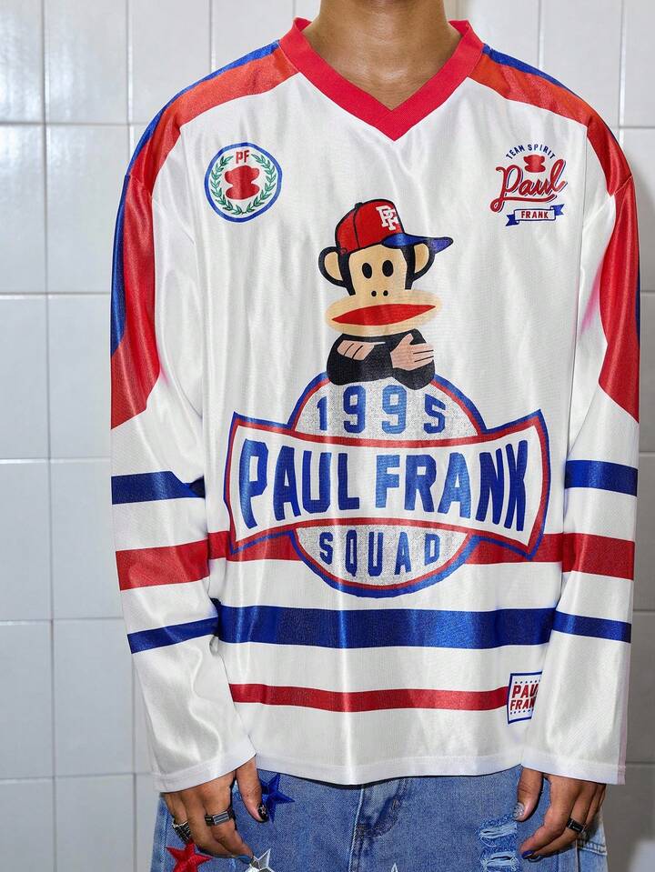 Paul Frank X ROMWE Men's Cartoon & Striped Contrast Color V-Neck Tee, Fall, Long Sleeve Top