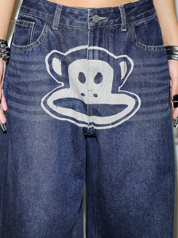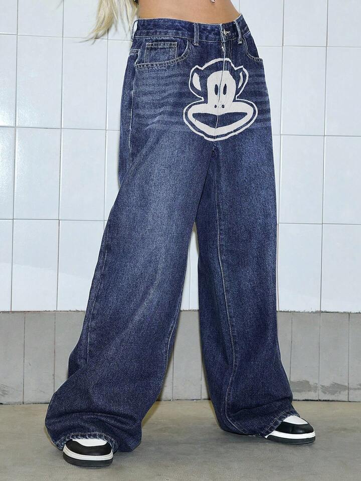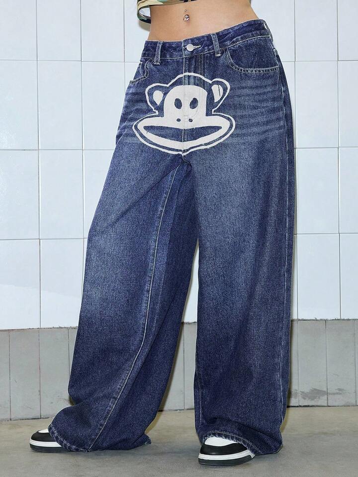 Paul Frank X ROMWE Y2K Streetwear Cartoon Graphic Vintage Washed Baggy Loose Fit Jeans