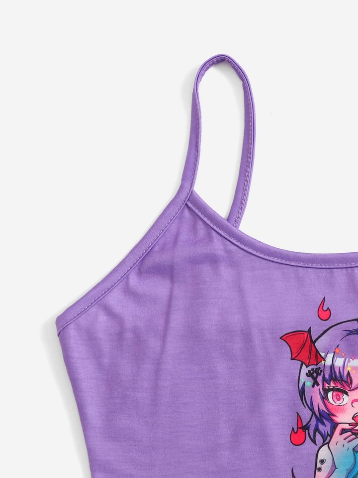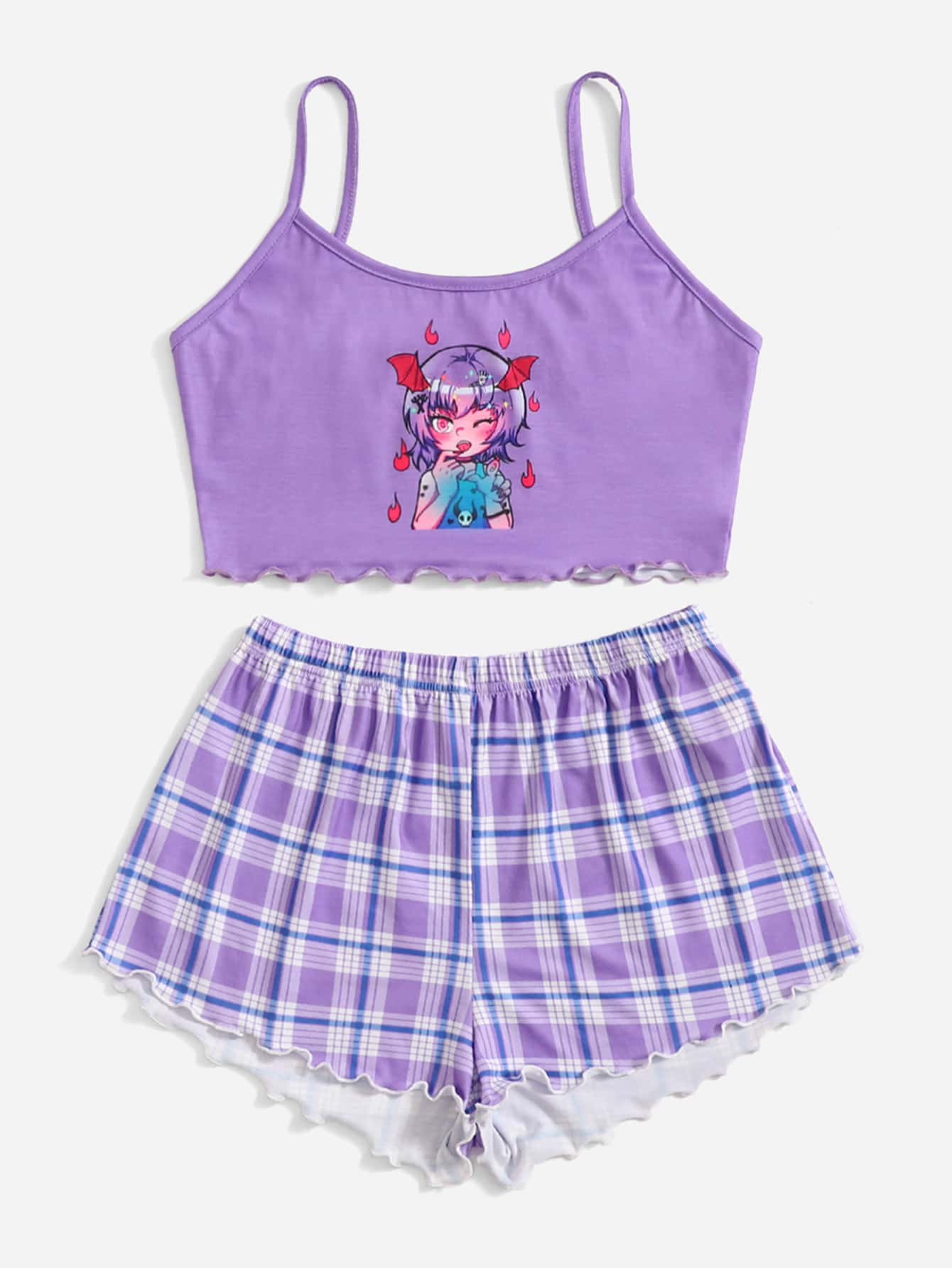 Plaid & Cartoon Figure Graphic Lettuce Trim Pajama Set