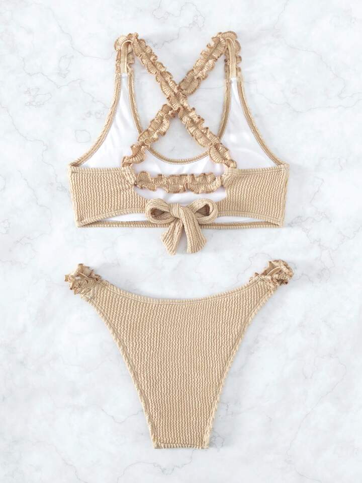 Plain Criss Cross Frill Trim Summer Beach Bikini Set
