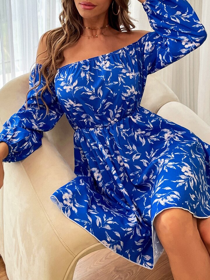Plant Print Off Shoulder Lantern Sleeve Dress