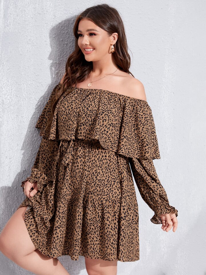 Plus Allover Print Off Shoulder Flounce Sleeve Ruffle Overlay Belted Dress