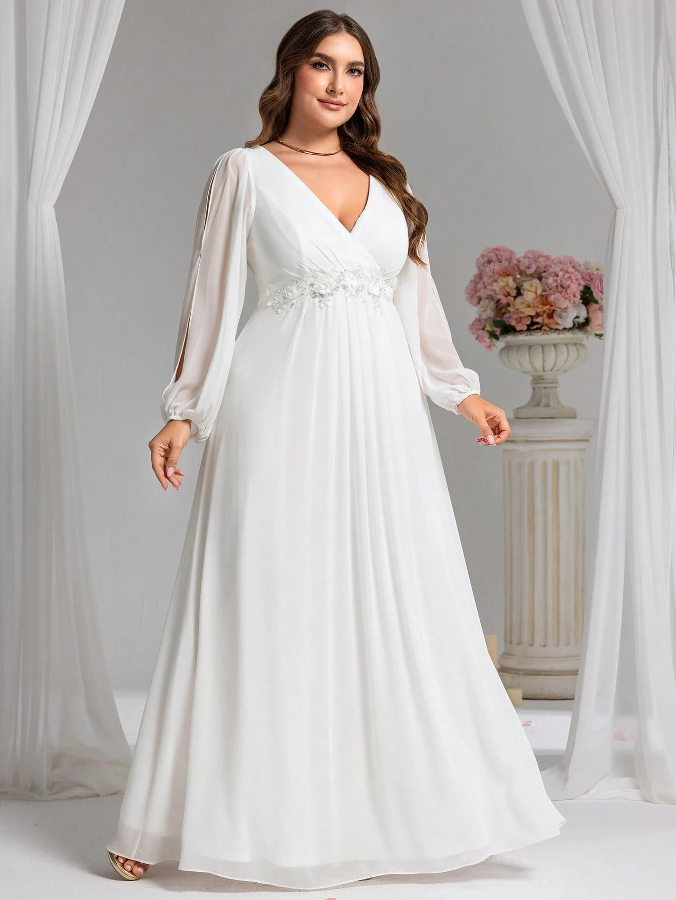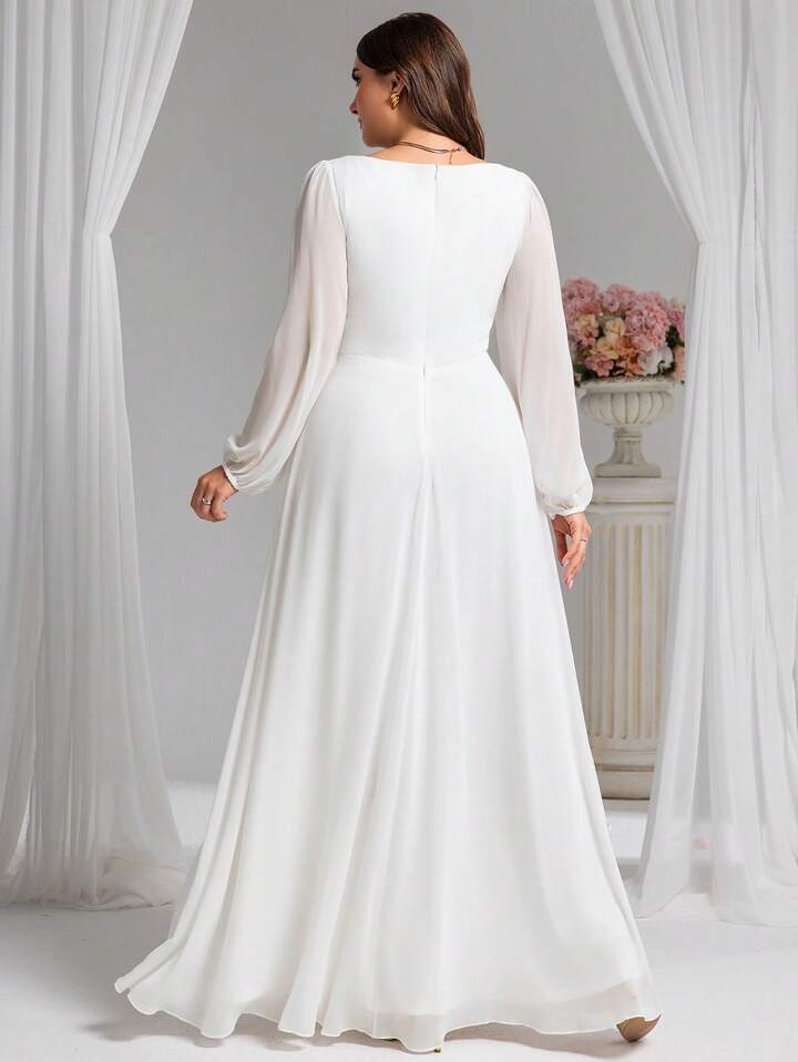 Plus Appliques Zip Back Long Sleeve Bridal Shower Dress White Elegant Formal Evening Prom Wedding Guest Gown, For Graduation, Dinner
