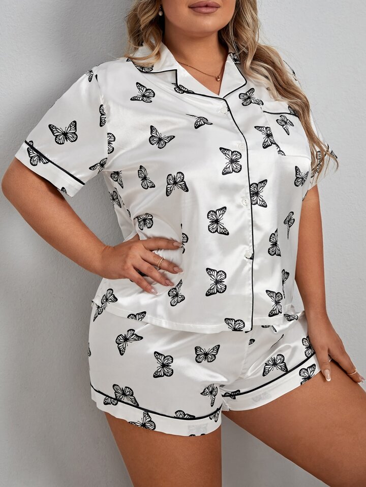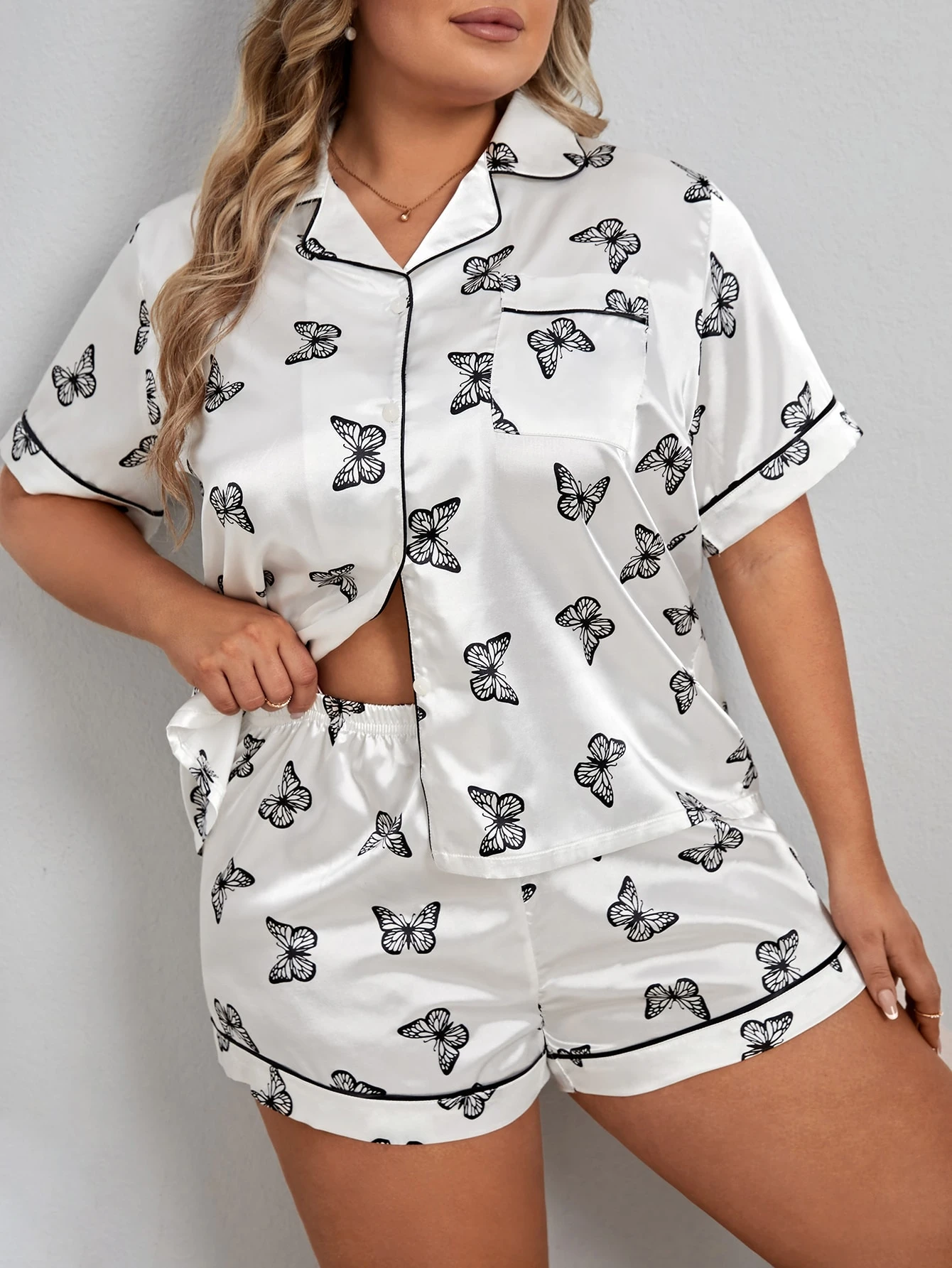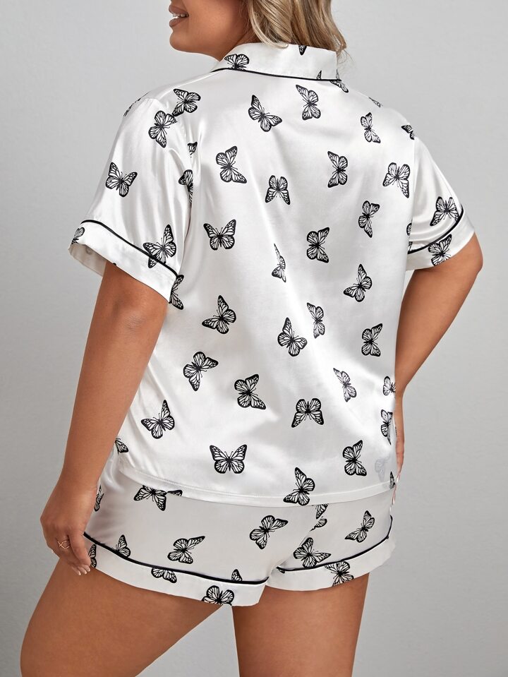 Plus Butterfly Print Contrast Piping Satin PJ Set