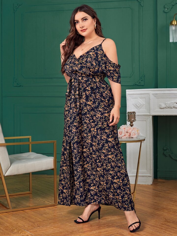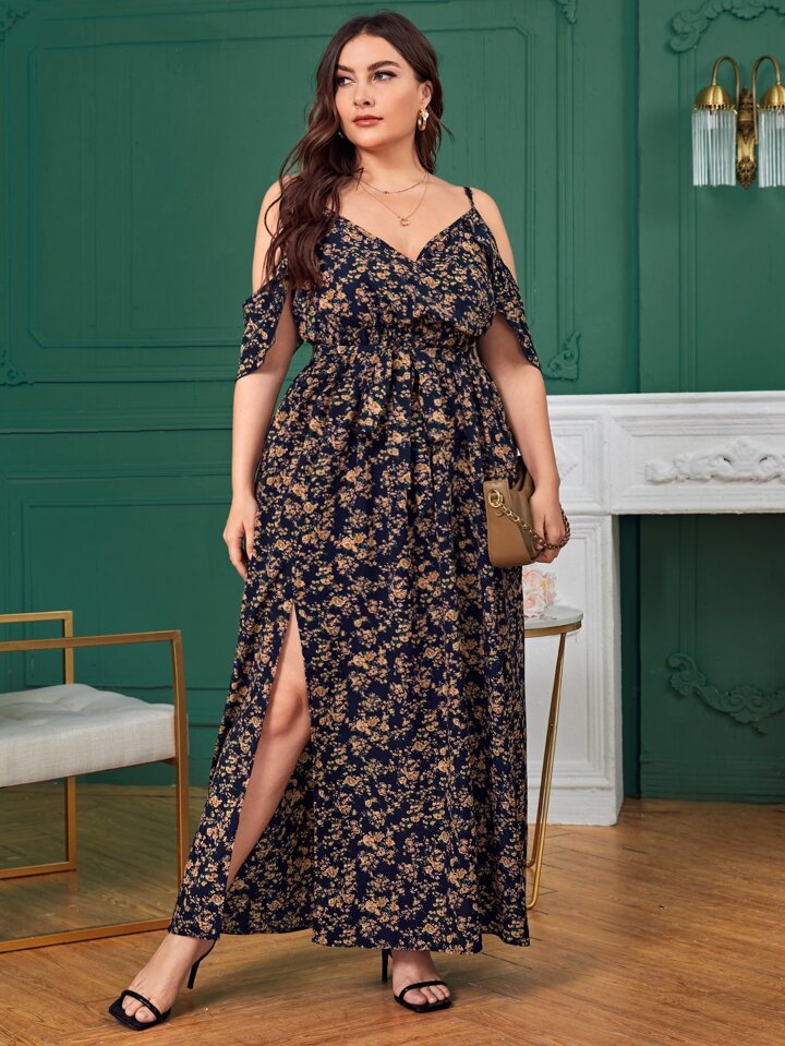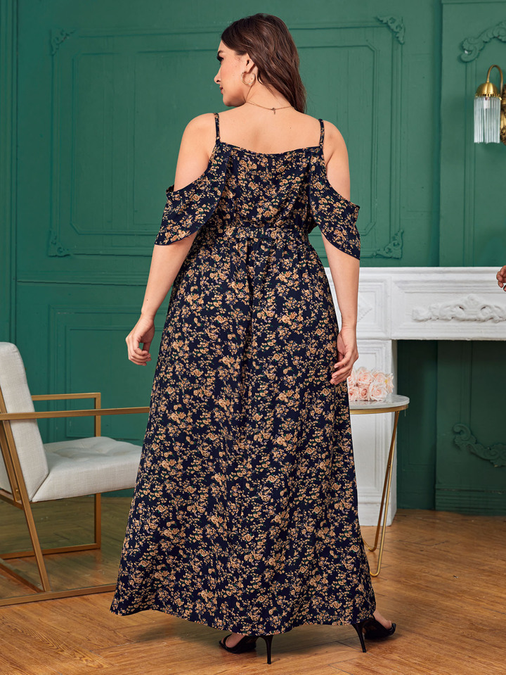 Plus Cold Shoulder Split Thigh Ditsy Floral Dress