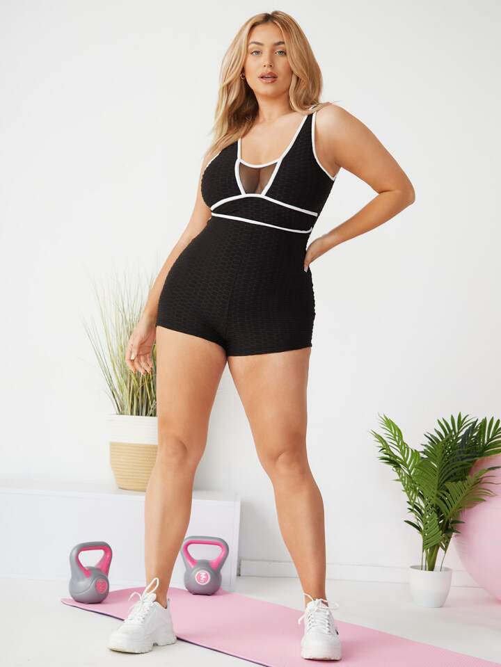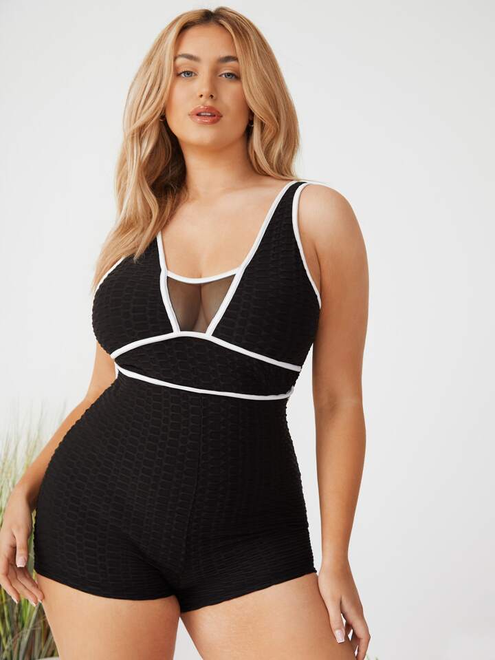 Plus Contrast Binding Mesh Panel Peekaboo Back Unitard Romper