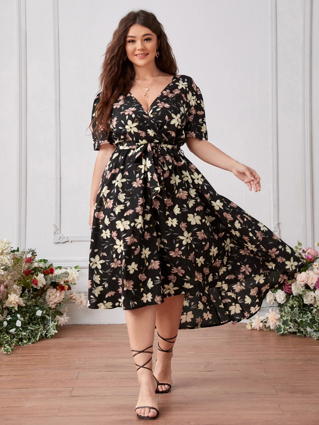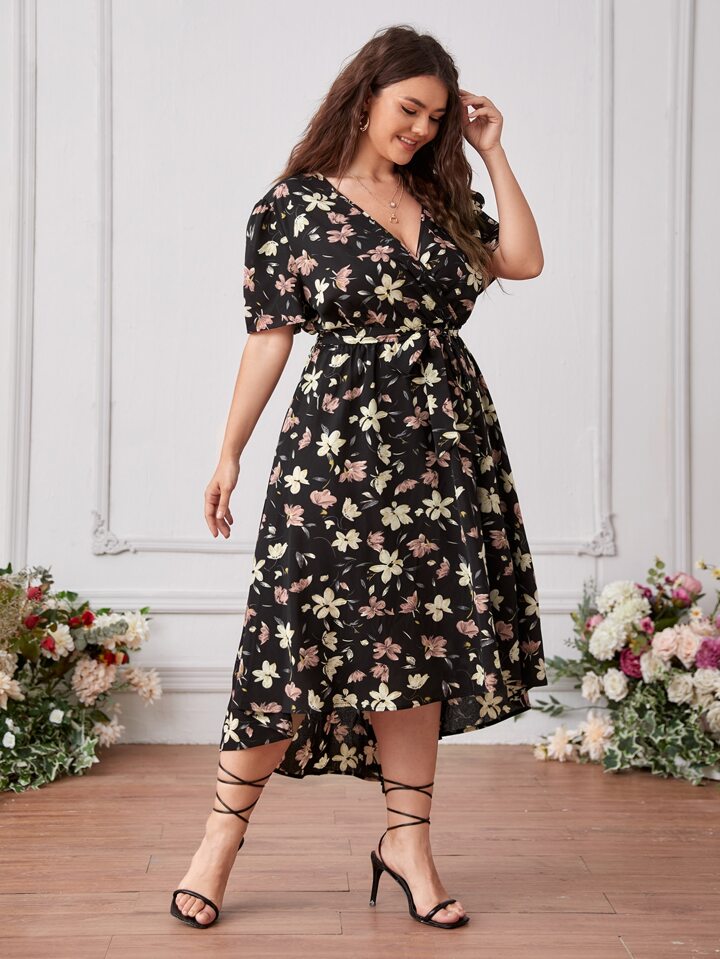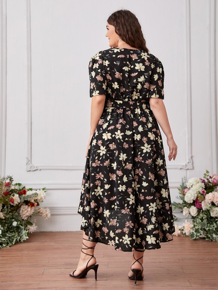 Plus Dip Hem Allover Floral Belted Dress