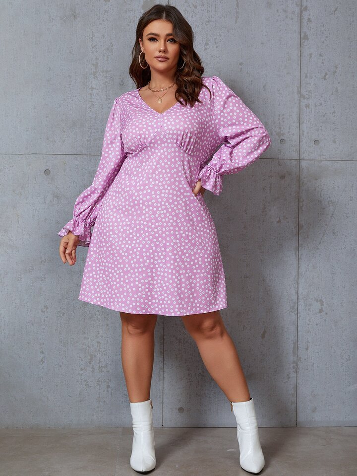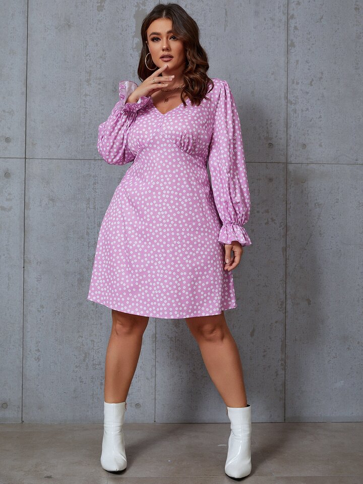 Plus Ditsy Floral Print Flounce Sleeve Dress