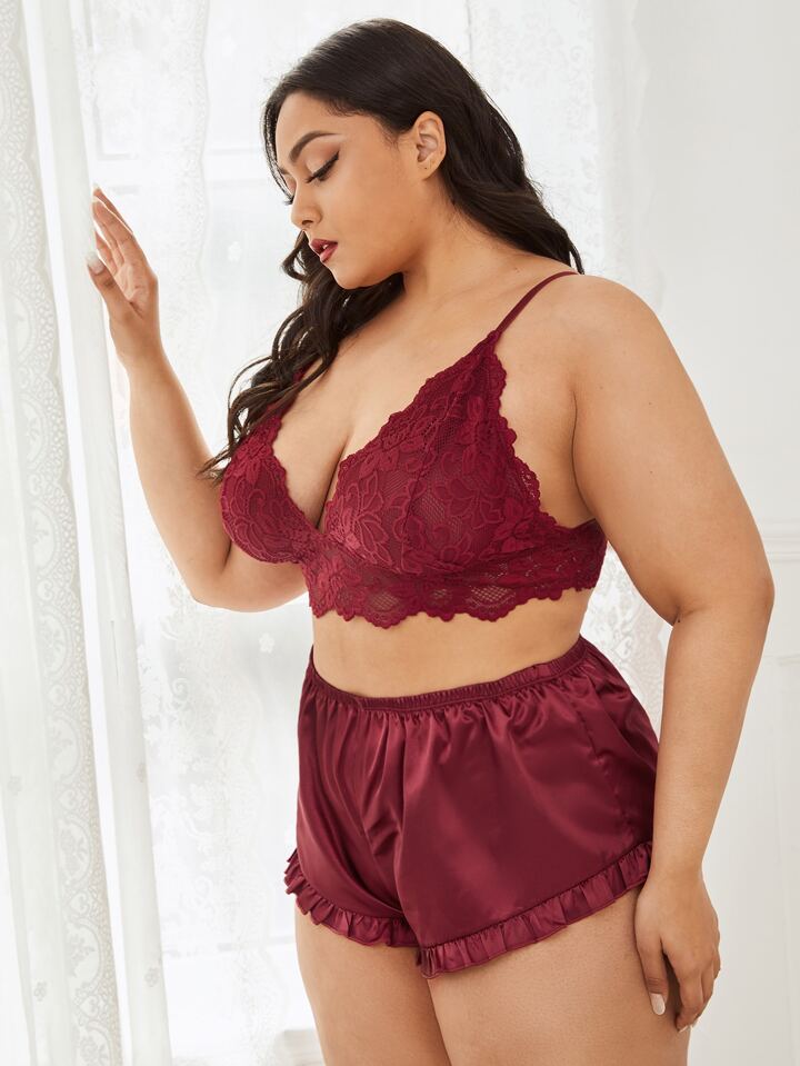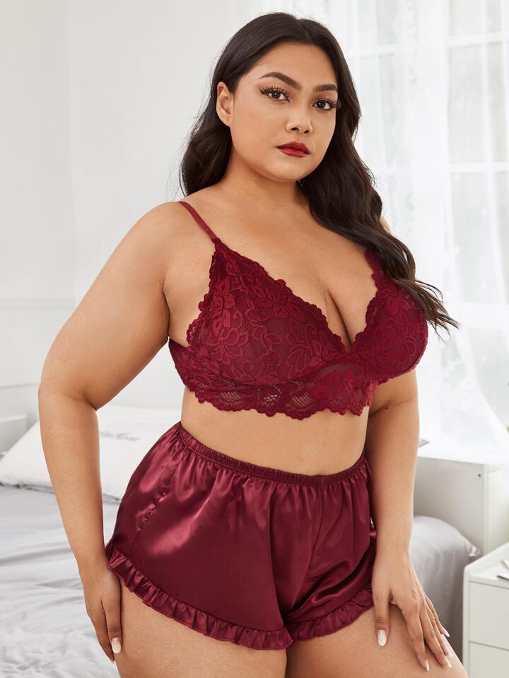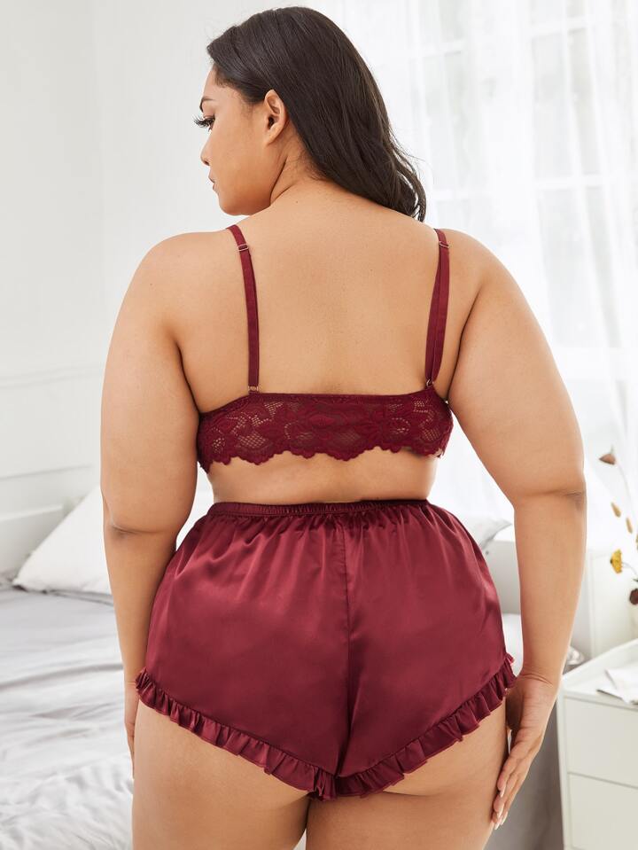 Plus Floral Lace Bralette & Frill Trim Satin Shorts