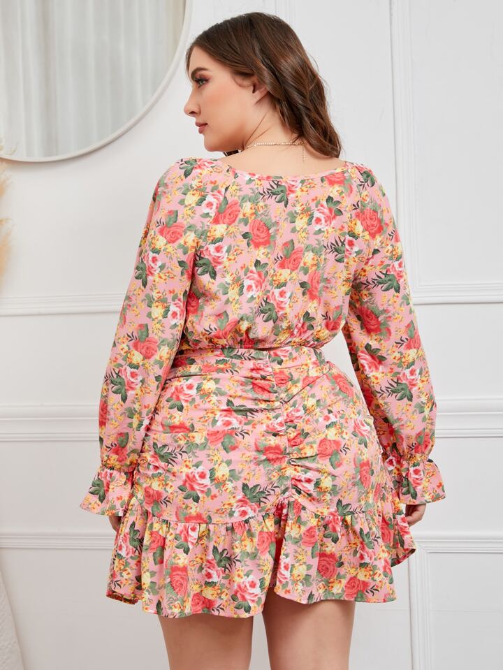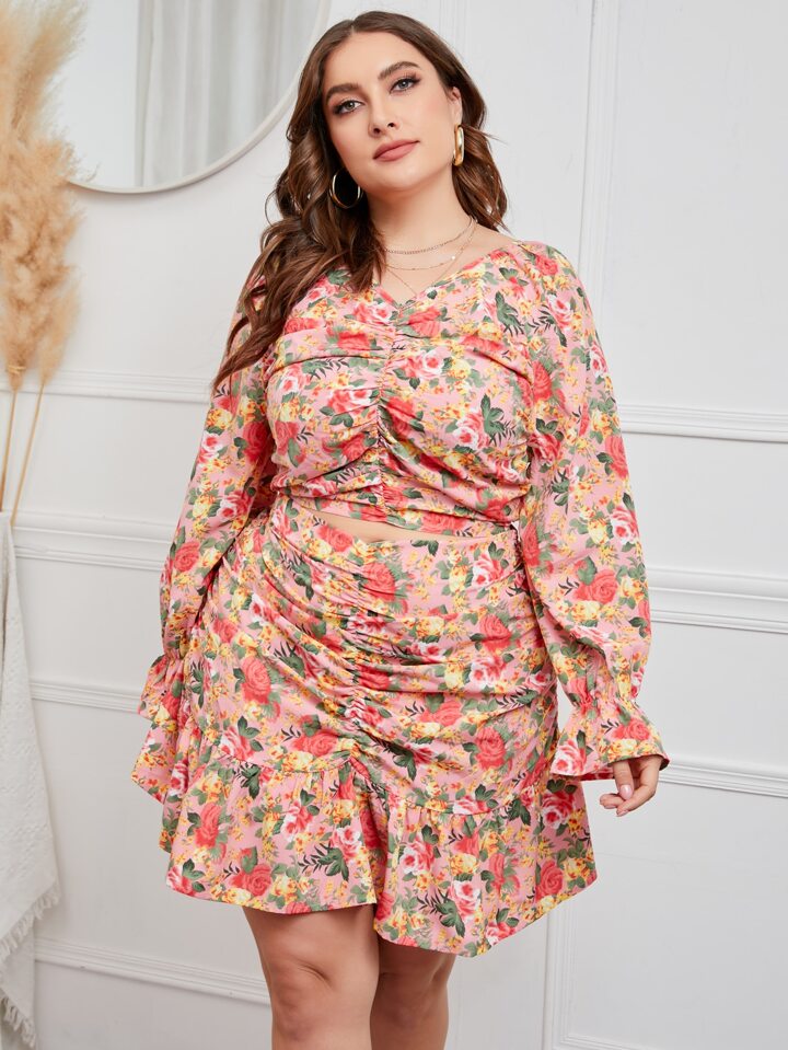 Plus Floral Print Flounce Sleeve Ruched Crop Top & Ruffle Hem Skirt