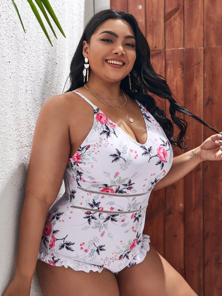 Plus Floral Print Frill One Piece Swimsuit