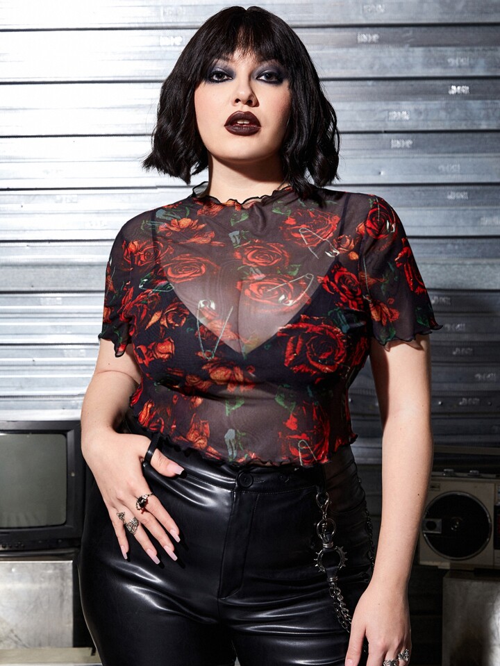 Plus Floral Print Lettuce Trim Mesh Top Without Bra