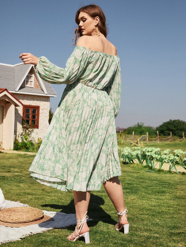 Plus Floral Print Pleated Lantern Sleeve Dress Without Belt