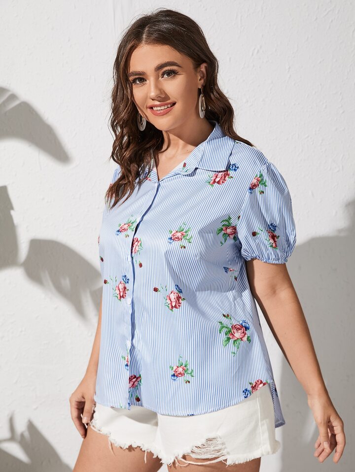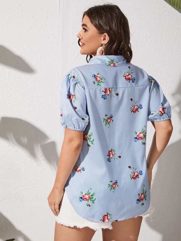Plus Floral & Striped Print Puff Sleeve Shirt
