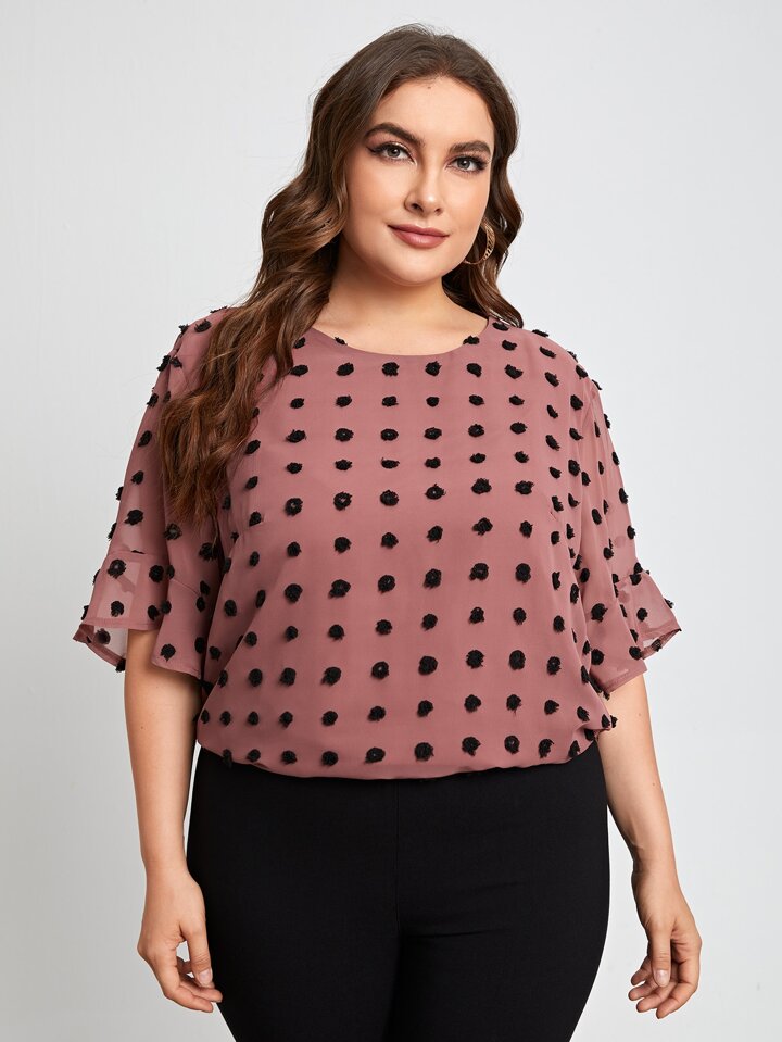 Plus Flounce Sleeve Contrast Swiss Dot Chiffon Top