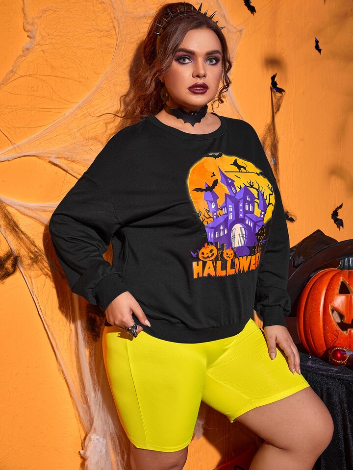 Plus Halloween & Letter Graphic Drop Shoulder Pullover