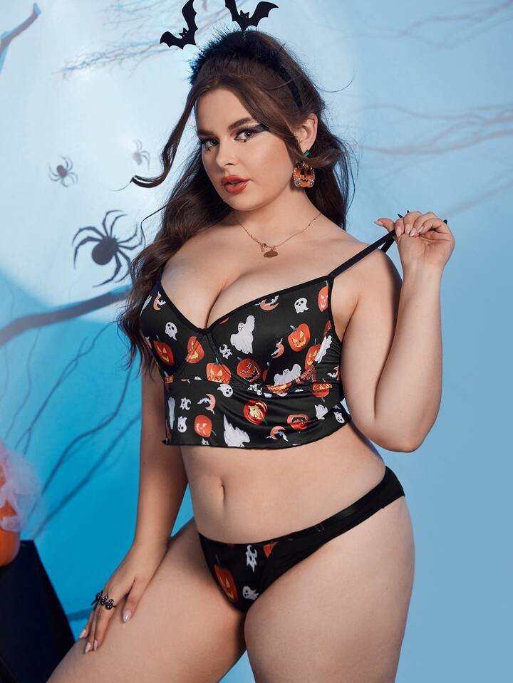 Plus Halloween Print Underwire Lingerie Set