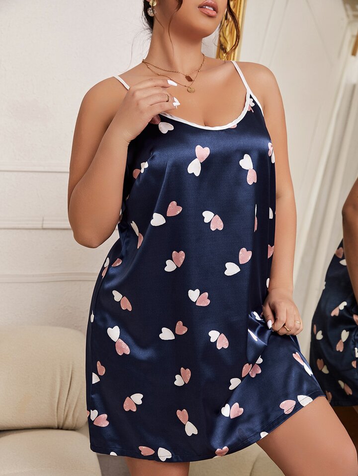 Plus Heart Print Contrast Binding Satin Cami Nightdress