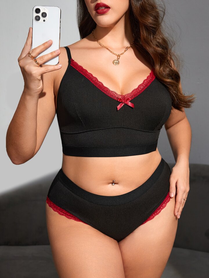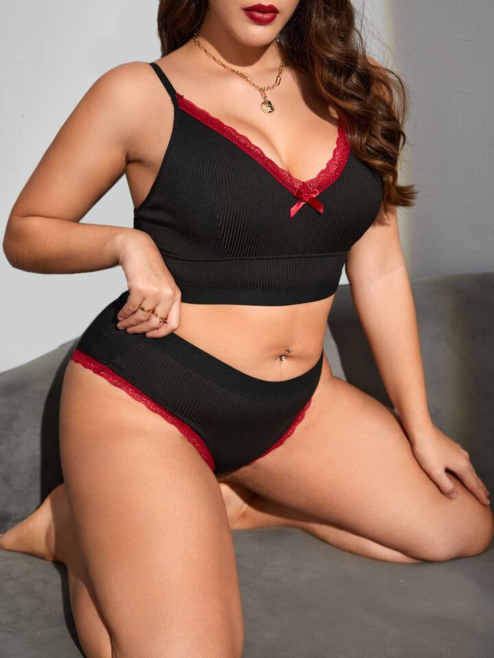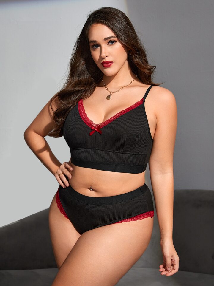 Plus Lace Trim Bow Front Lingerie Set