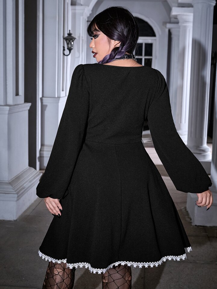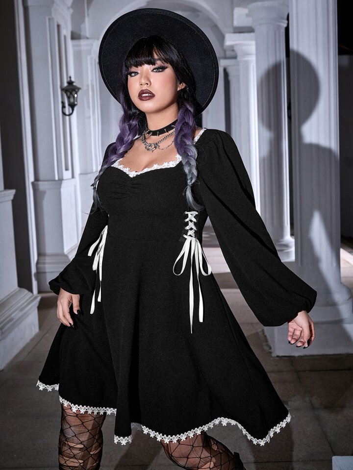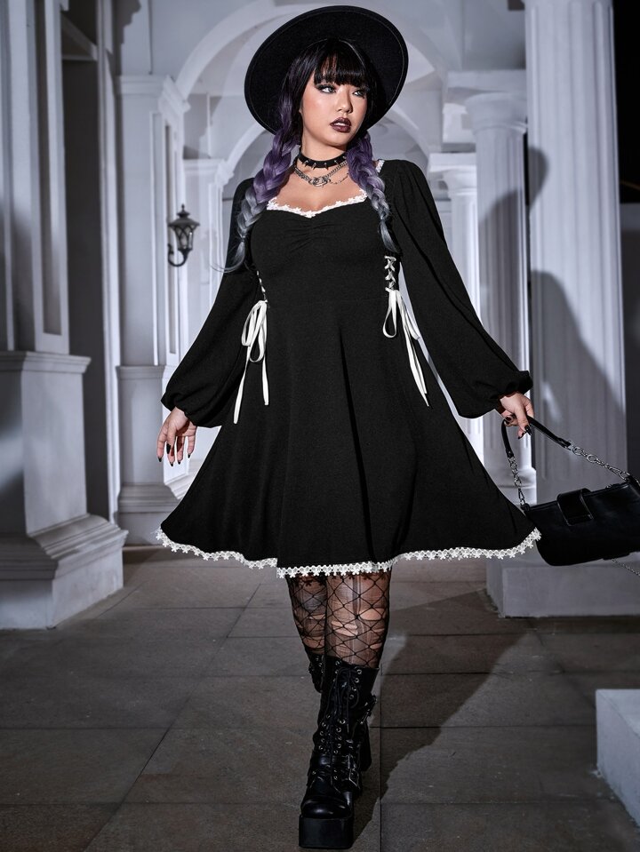Plus Lace Up Side Guipure Lace Trim Lantern Sleeve Dress