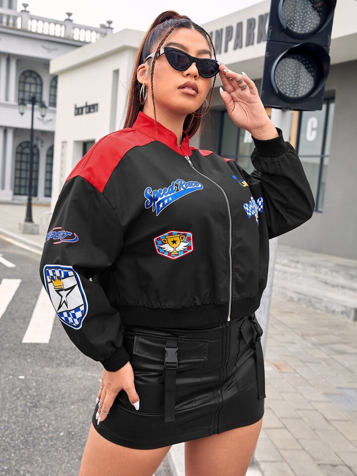 Plus Letter Graphic Colorblock Drop Shoulder Bomber Jacket
