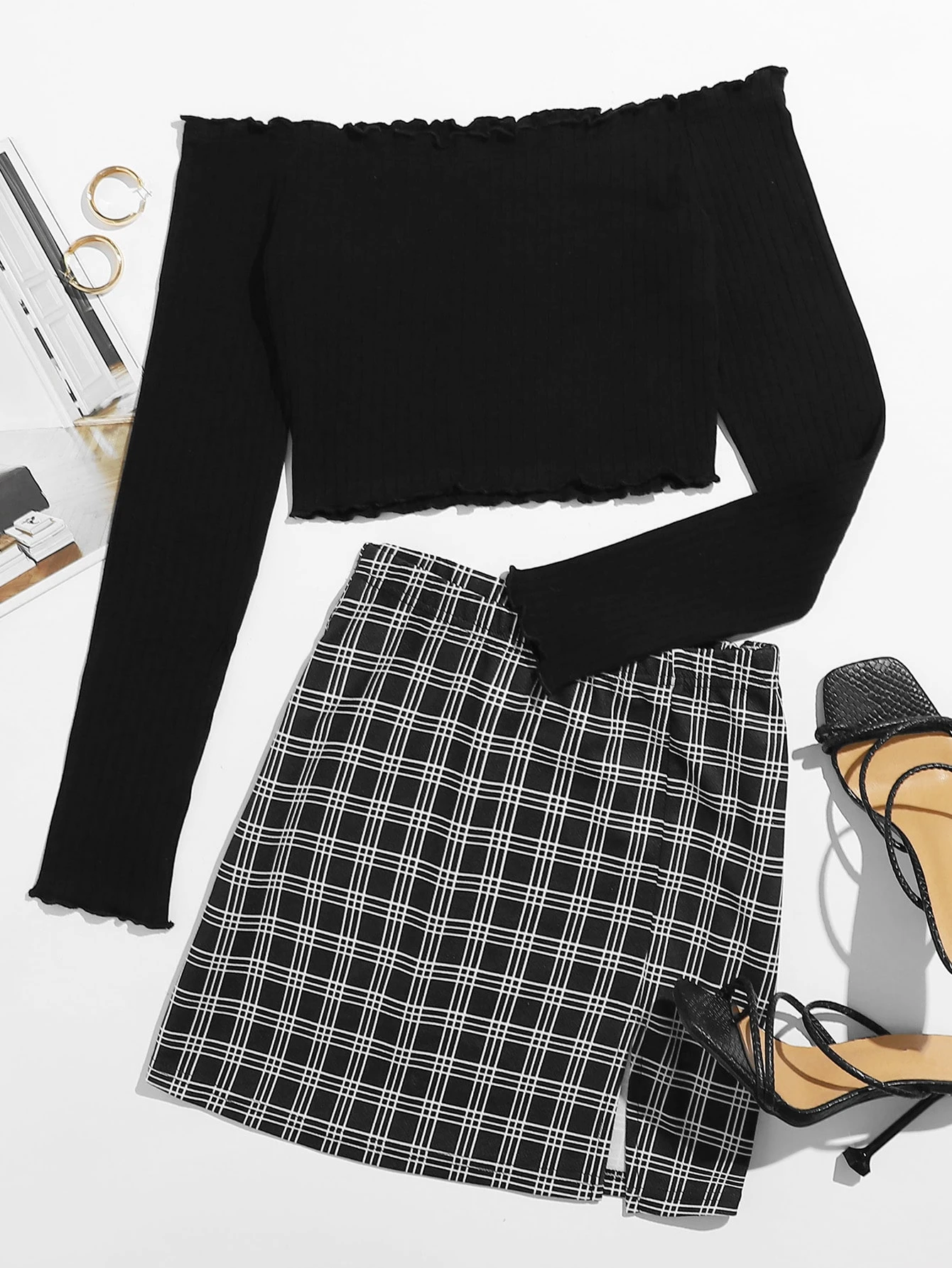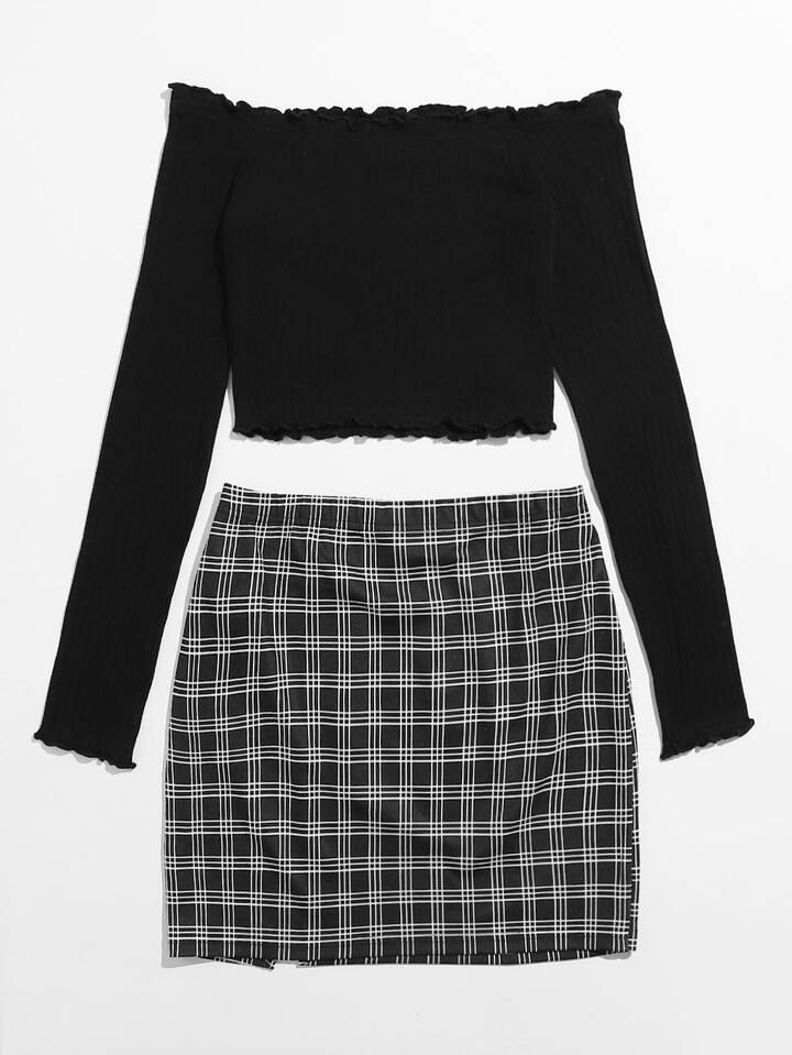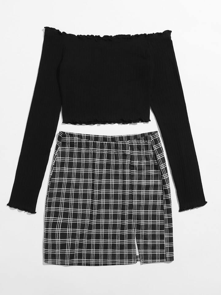 Plus Lettuce Trim Bardot Crop Top & Split Hem Plaid Skirt Set