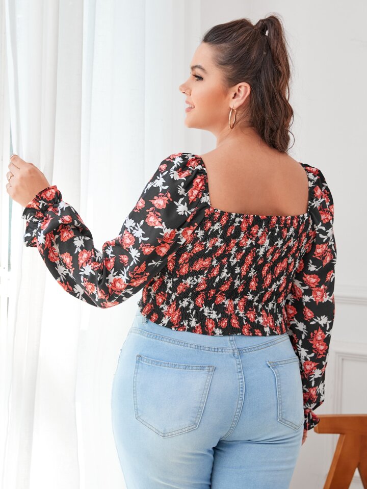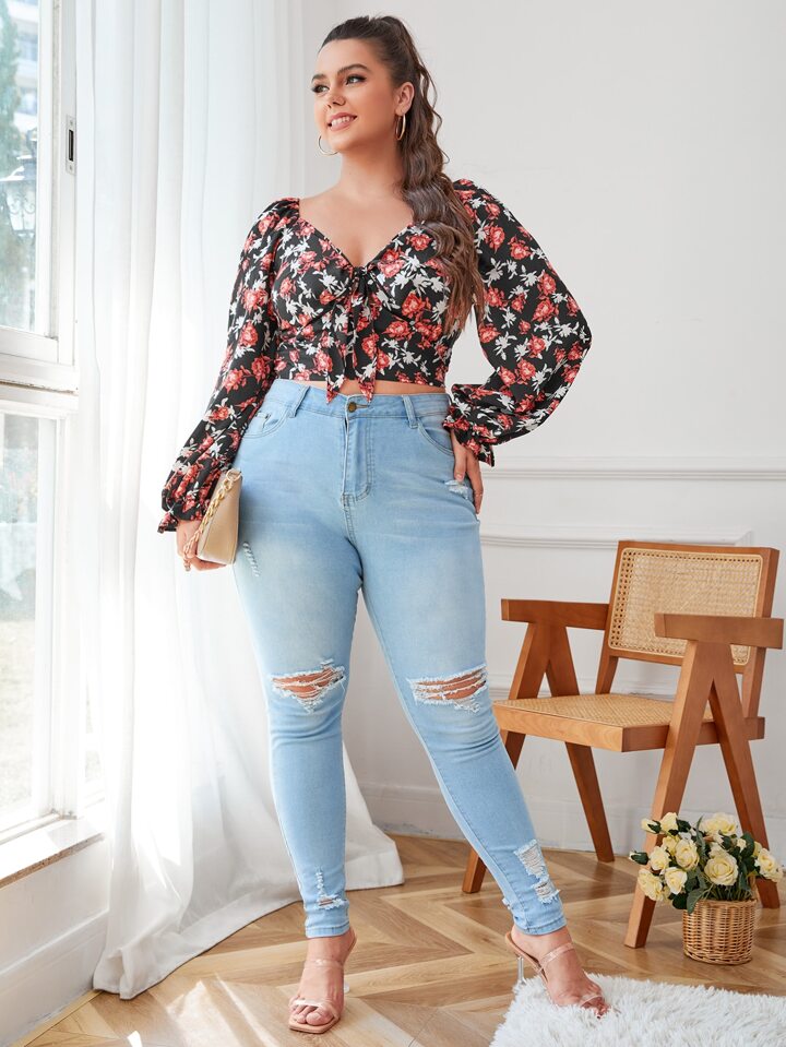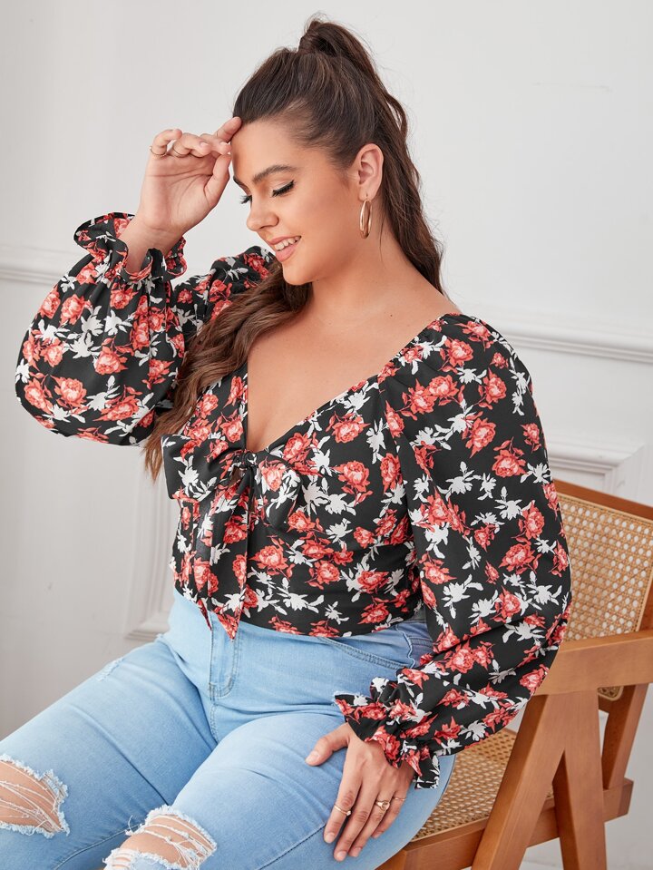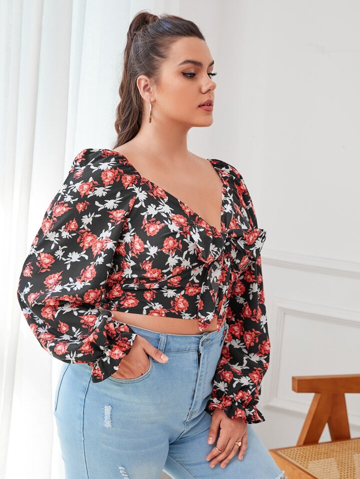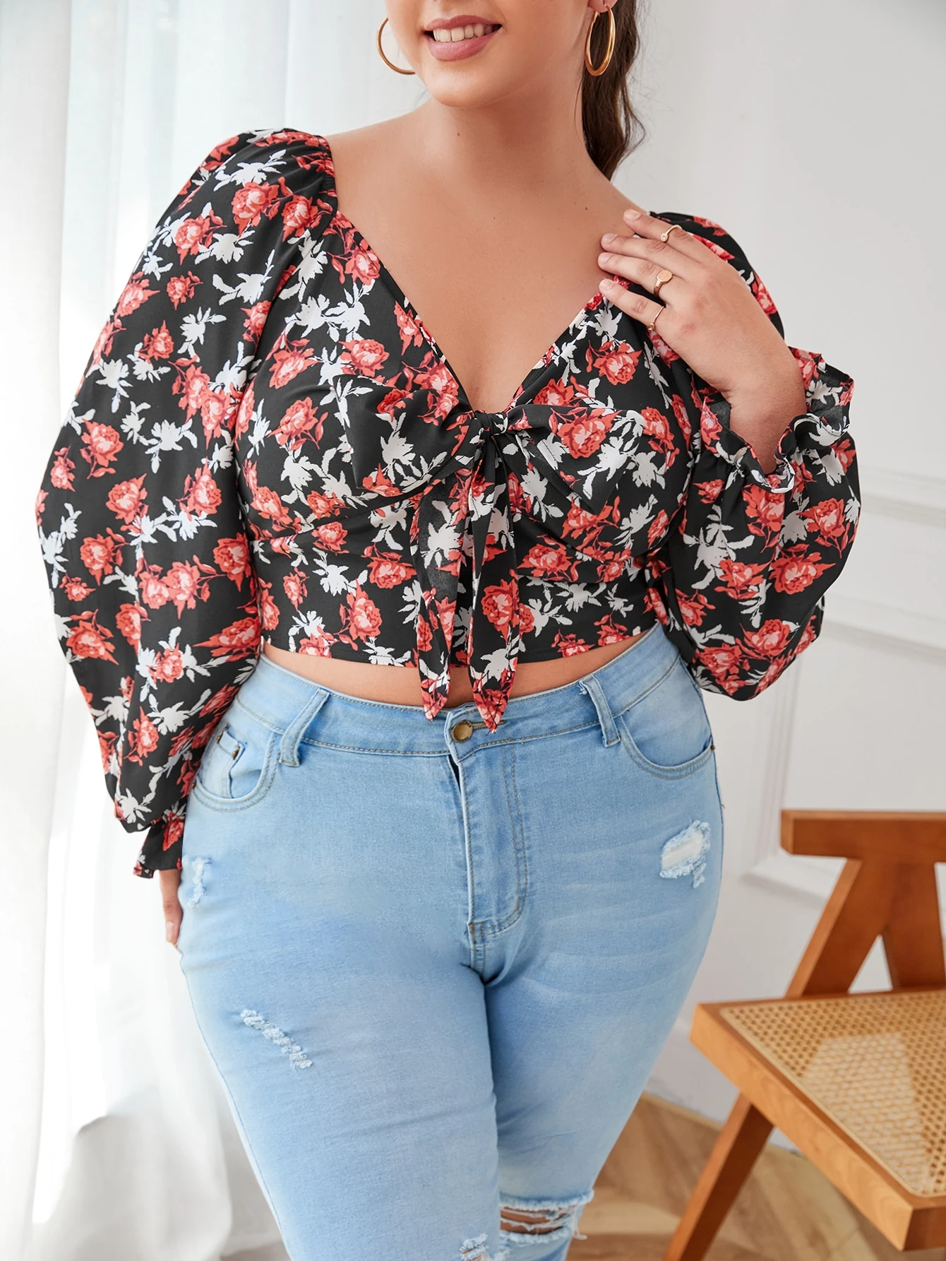 Plus Plants Print Bishop Sleeve Tie Front Crop Blouse
