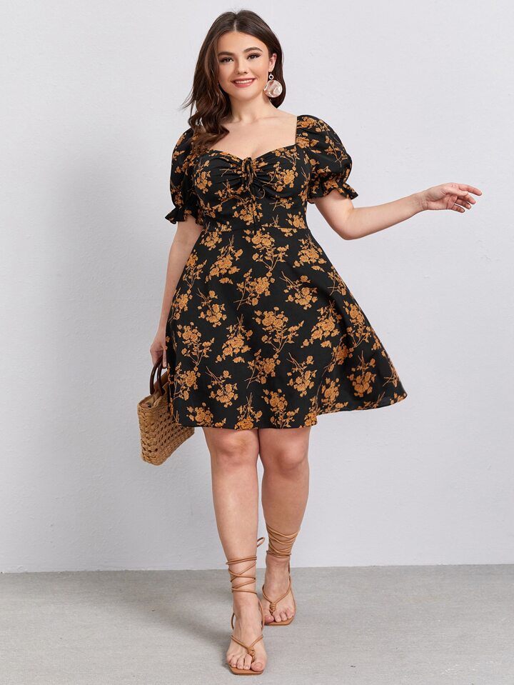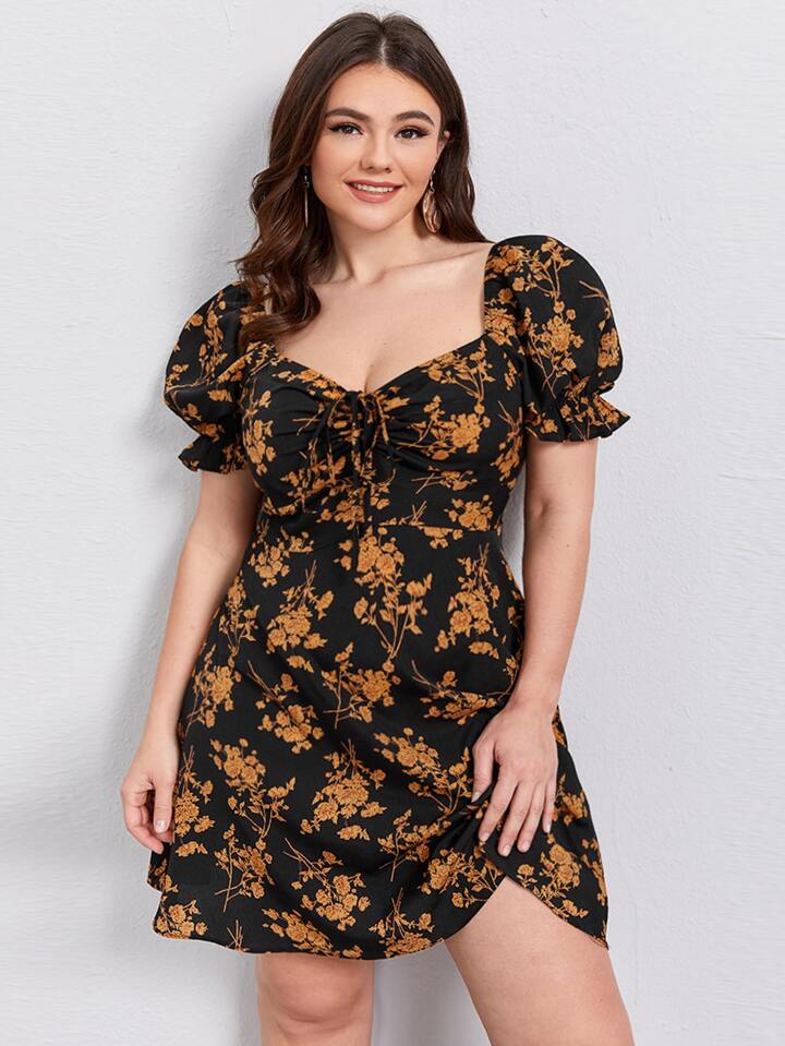 Plus Puff Sleeve Ruched Bust Floral Milkmaid Dress