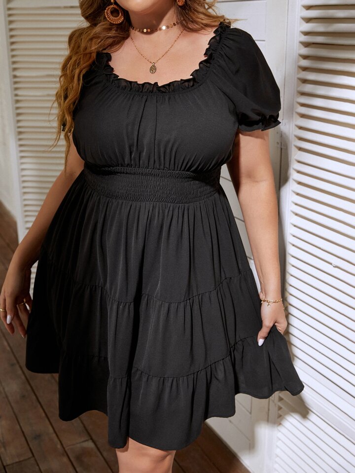 Plus Puff Sleeve Shirred Waist Ruffle Hem Dress