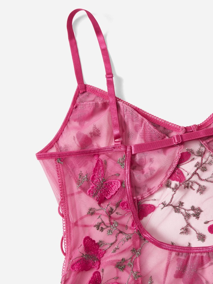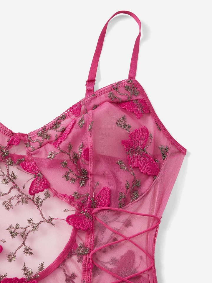 Plus Size Butterfly Embroidered Mesh Lace-Up Side Teddy Bodysuit