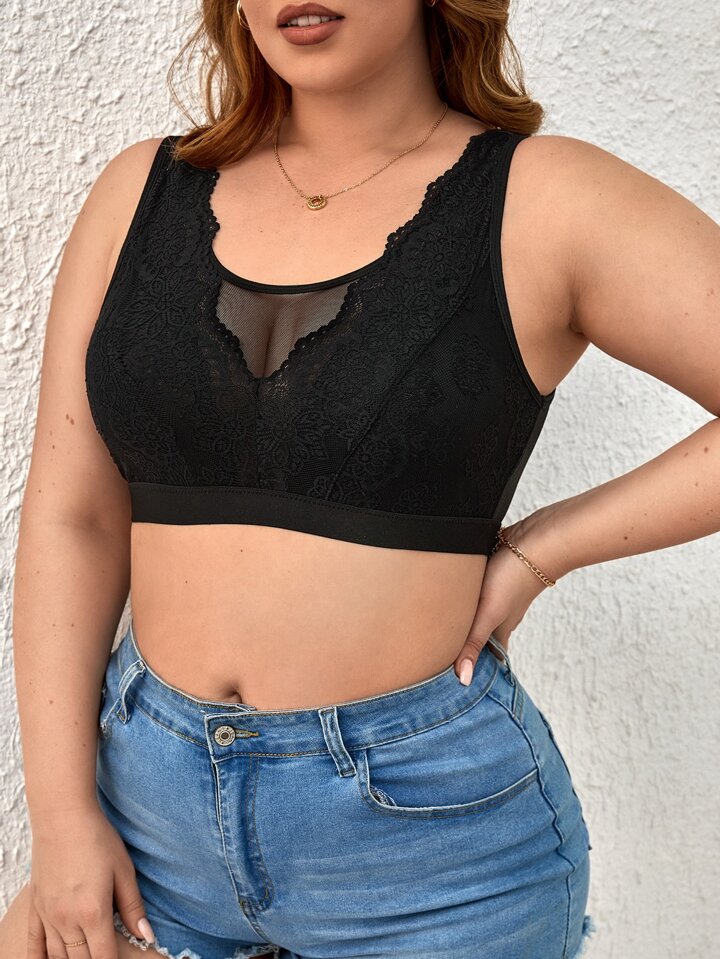 Plus Size Contrast Mesh Lace Bra Semi-Sheer Wireless Lingerie