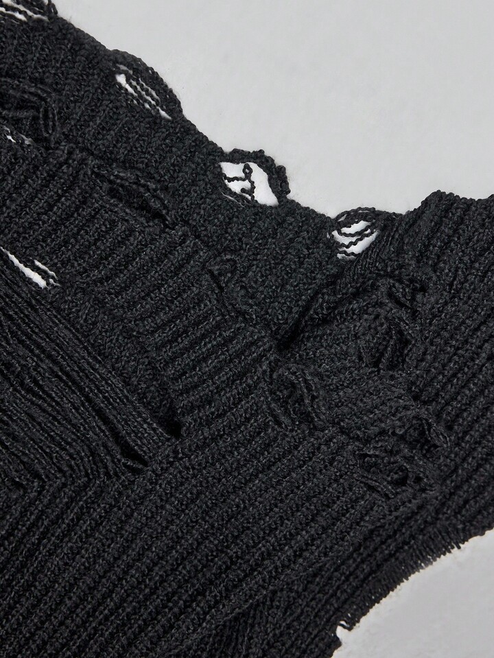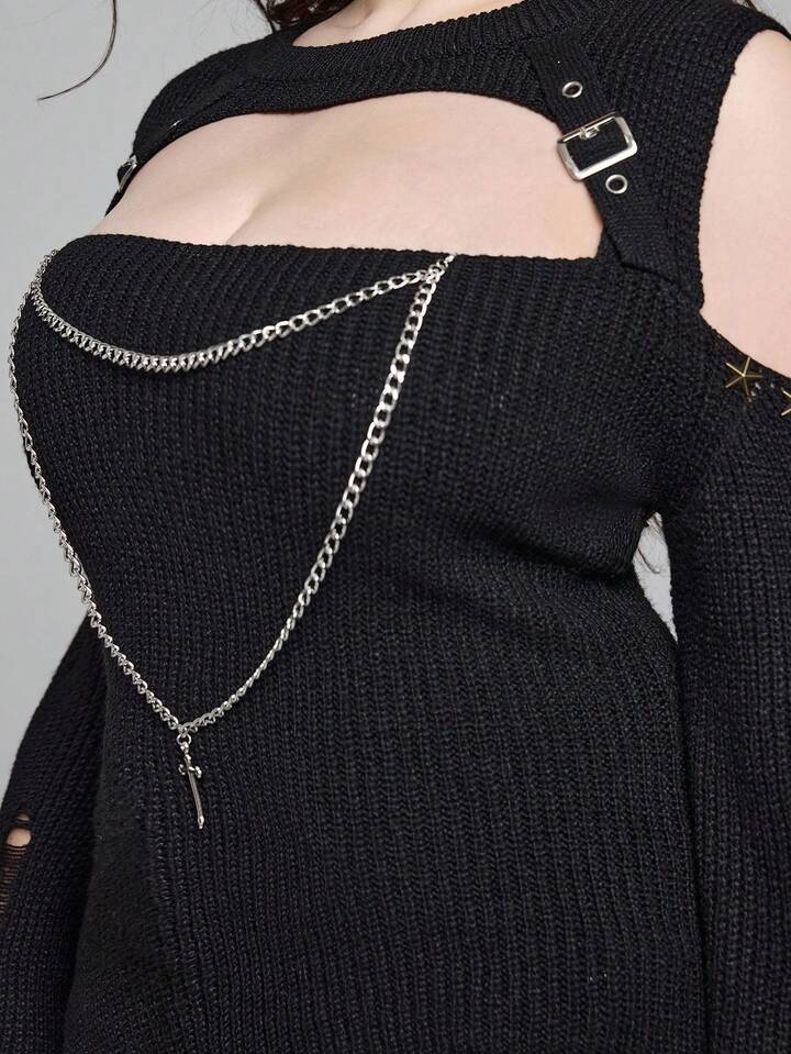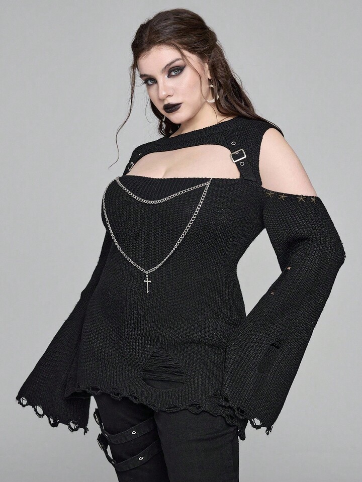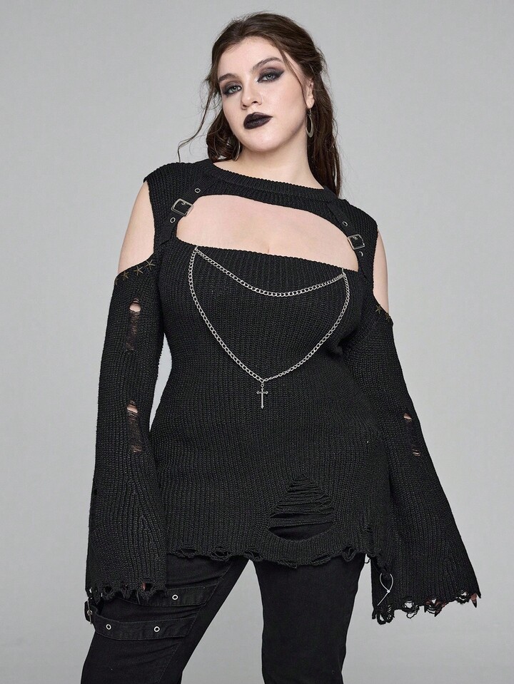 Plus Size Gothic Cross Double Chain Ripped Black Sweater, Autumn/Winter Distressed Fashion Retro Gothic Style Plus Size Women Pullover Sweater, Plus Size Women Sweater Top, Party Evening Street Punk Gothic Style Plus Size Women Black Pullover Sweater