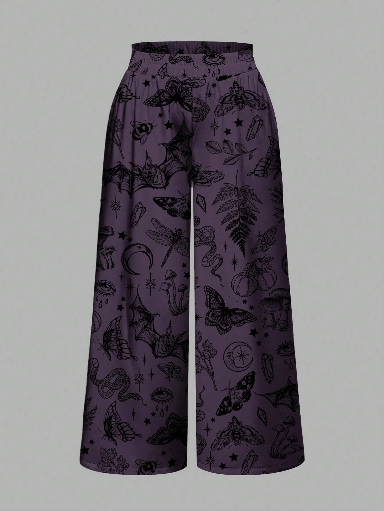 Plus Size Gothic Mysterious Bat Wing, Sun, Moon, Dragonfly, Mushroom, Eye Print Loose Wide Leg Pants