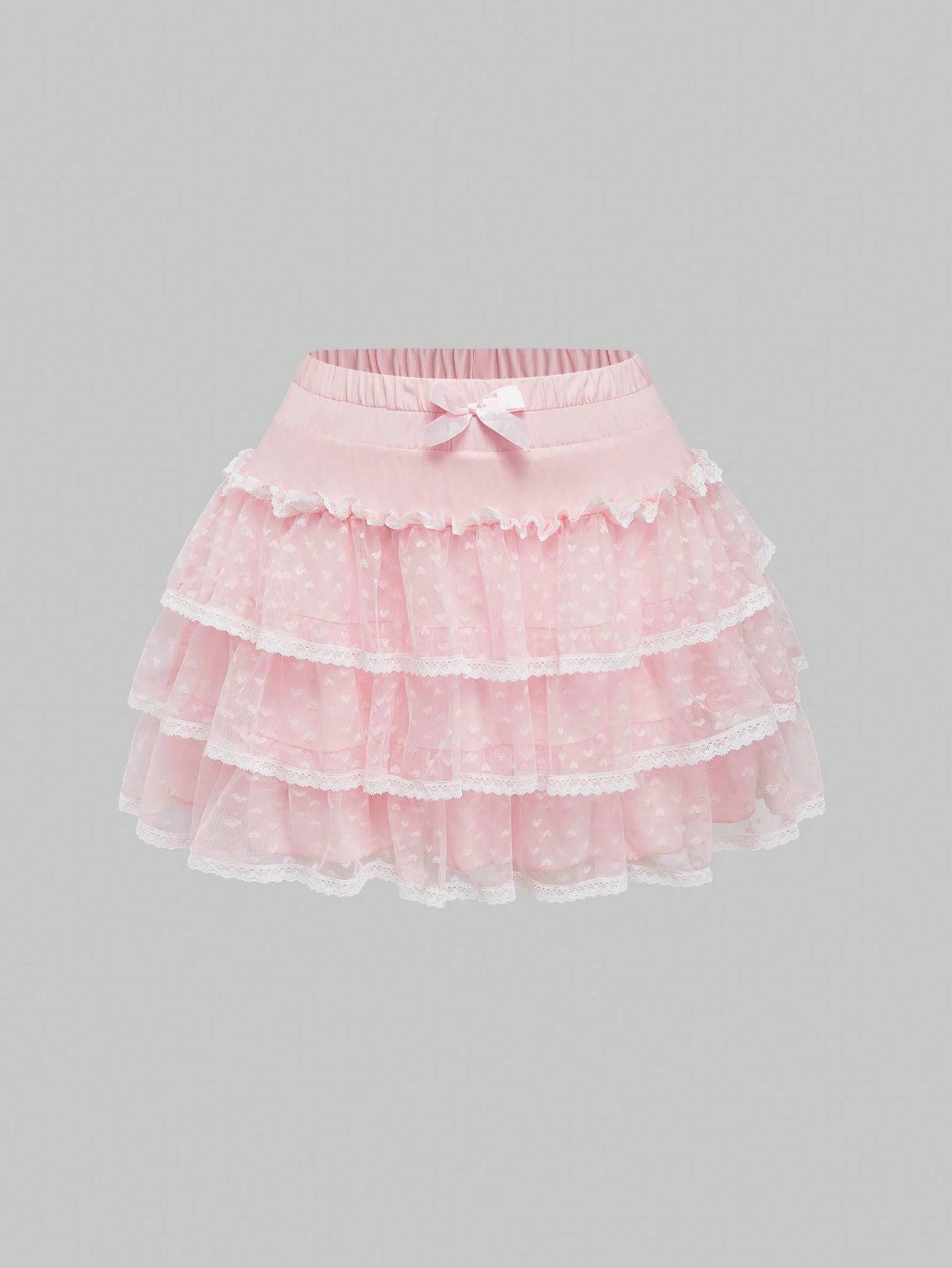 Plus Size Kawaii Heart Lace Bow Layered Cake Skirt