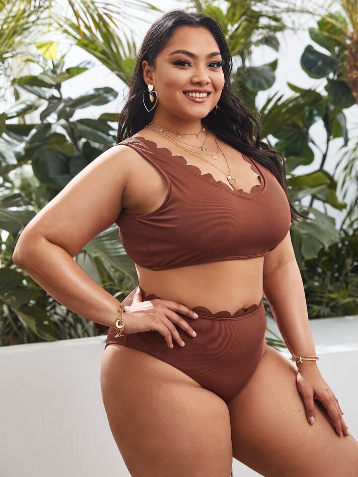 Plus Size Rib Scalloped Trim Bikini Set Summer Beach
