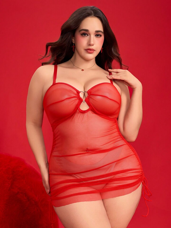 Plus Size Romantic Valentine's Day Metal Heart Ruched Mesh Sexy Dress