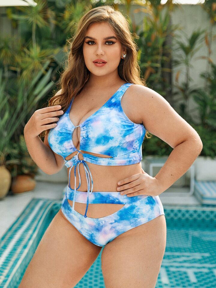Plus Size Tie Dye Cut-Out Lace Up Bikini Set Summer Beach
