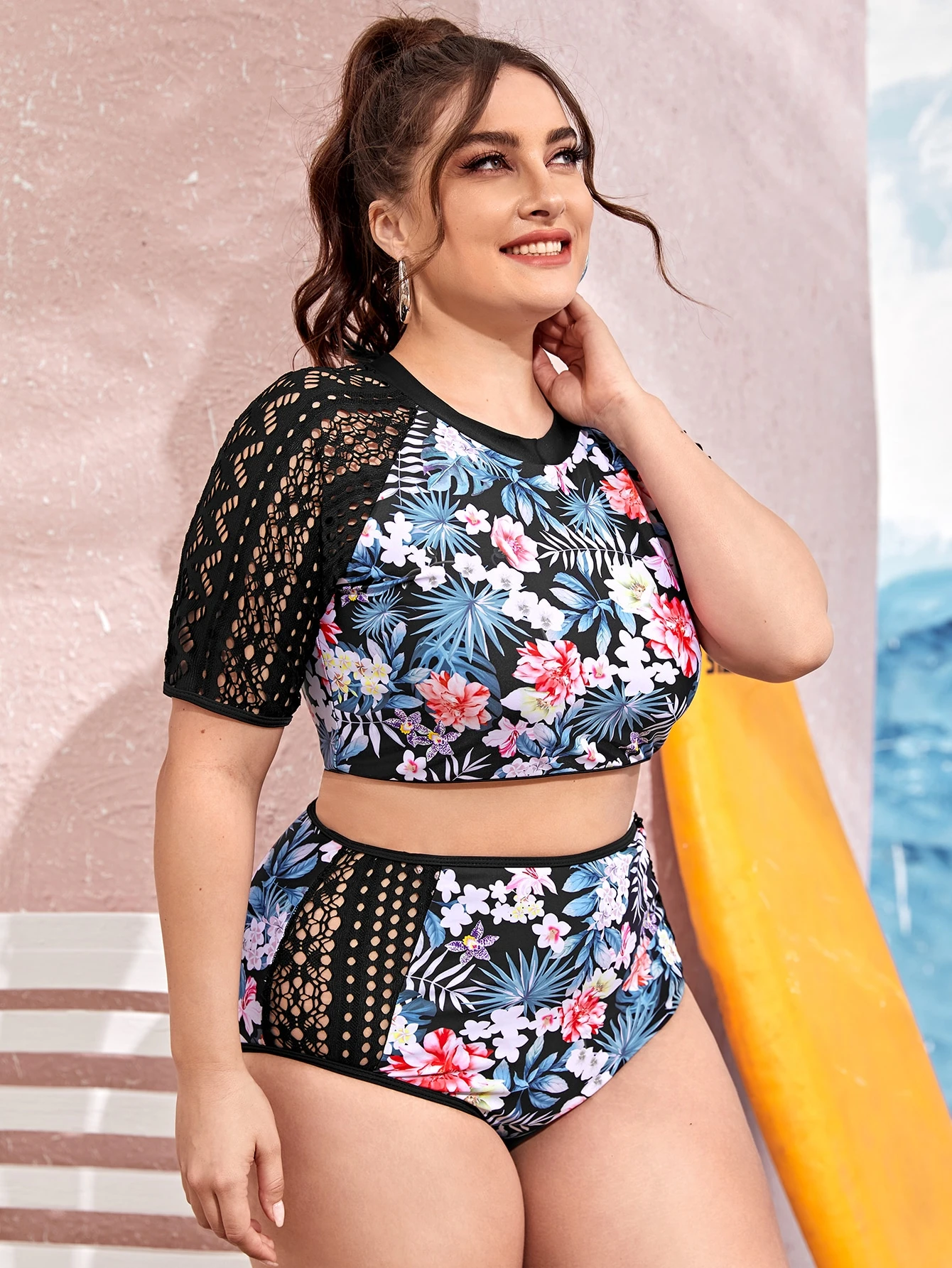 Plus Size Tropical & Floral Hollow-Out Bikini Set With Short Sleeve Summer Beach