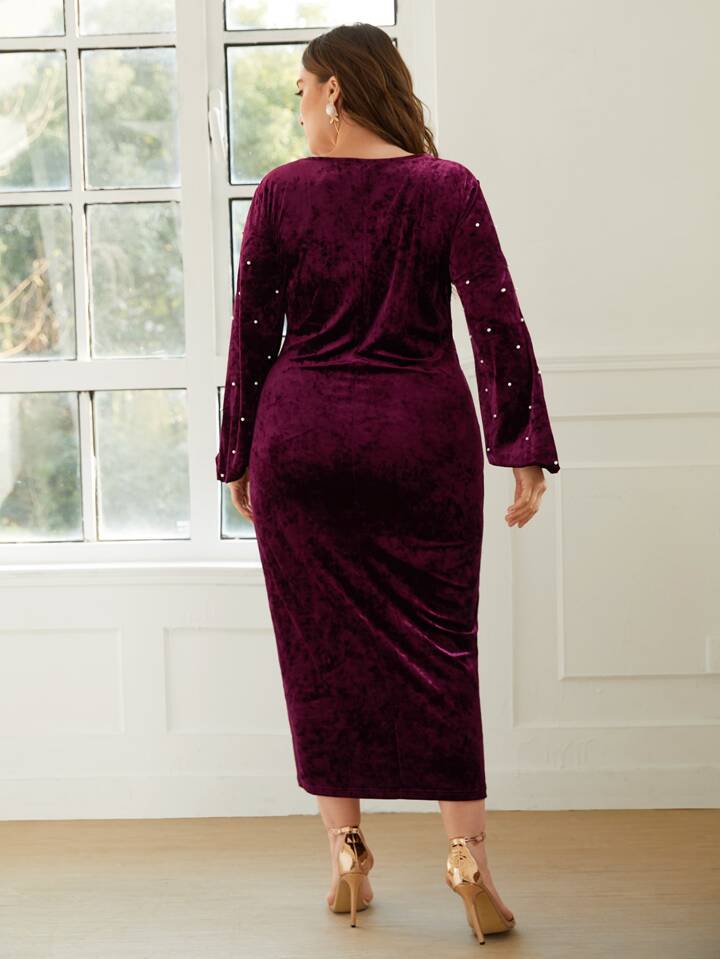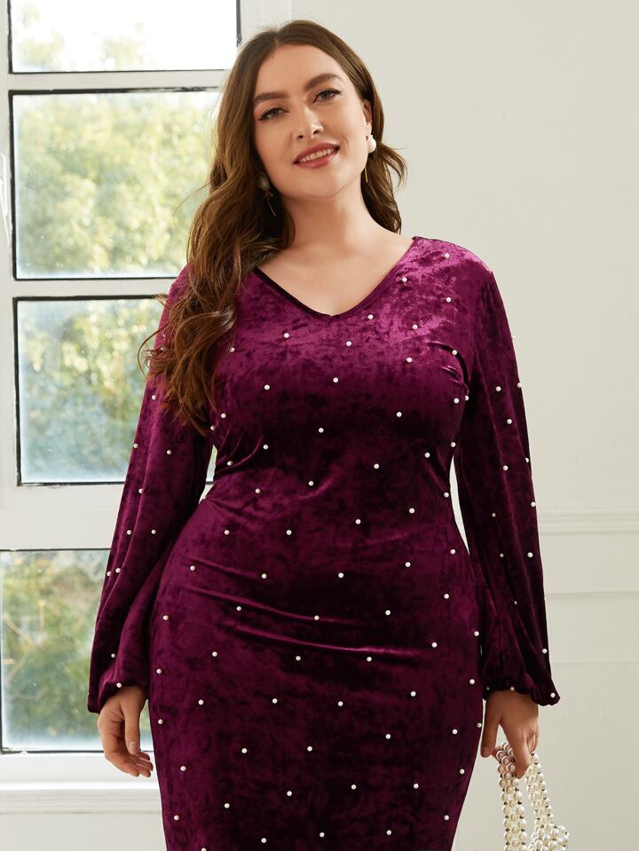 Plus Size Velvet Faux Pearls Detail Fitted Dress