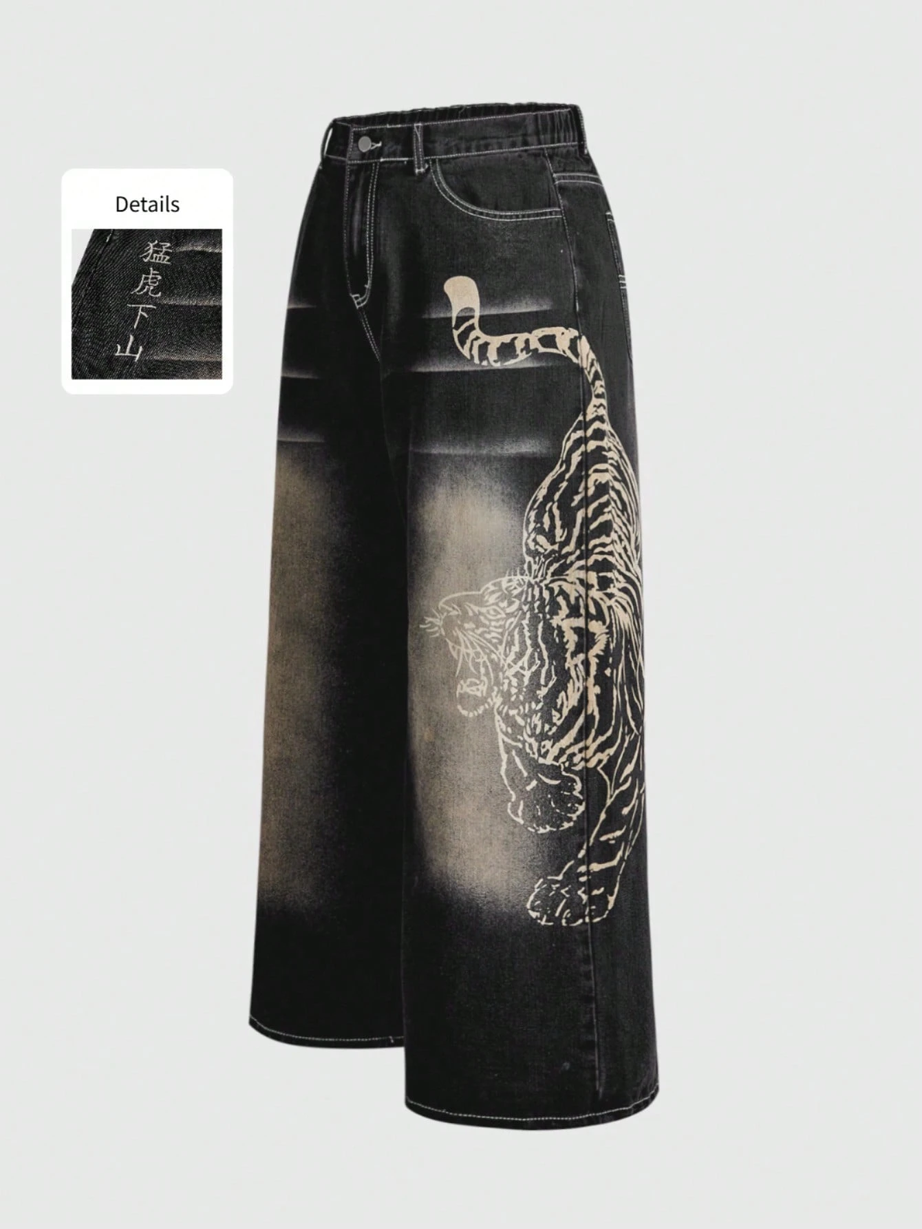 Plus Size Vintage Washed New Chinese Style Chinese Character Tiger Embroidery Wide Leg Jeans