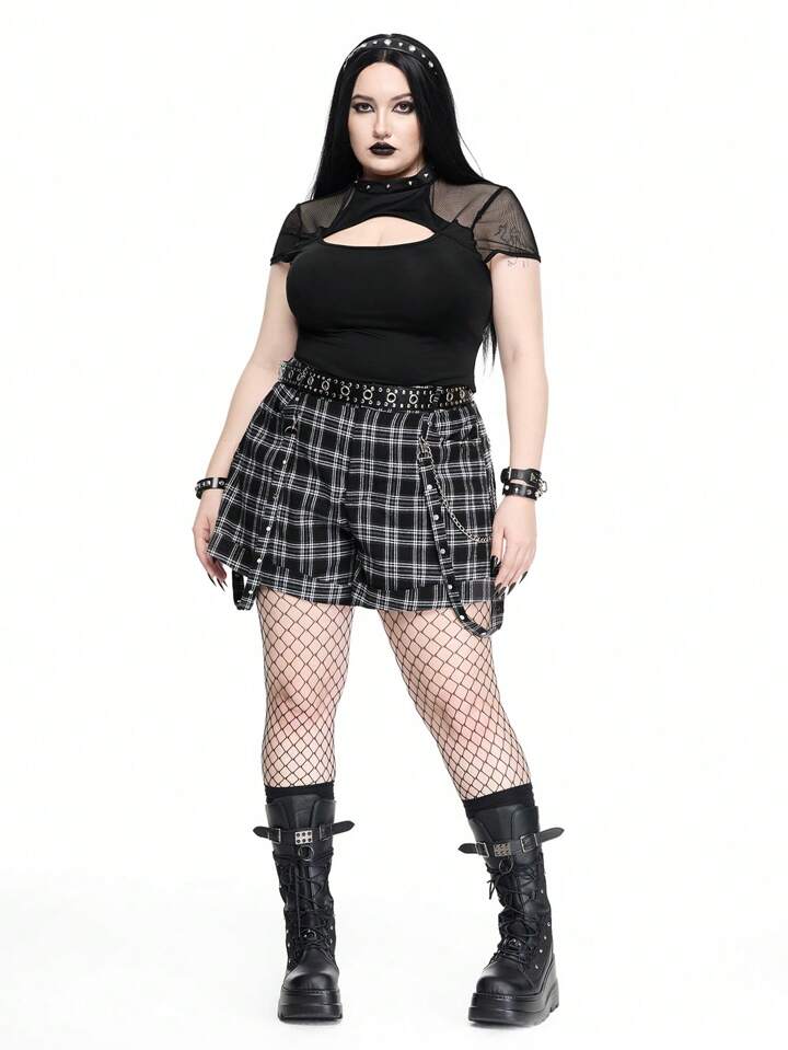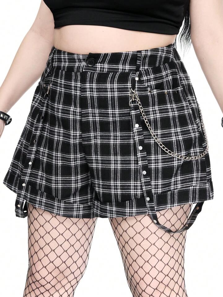 Plus Size Women Gothic Plaid Pocket & Rivet Decor Shorts, Waist Strap Detachable, Back To School