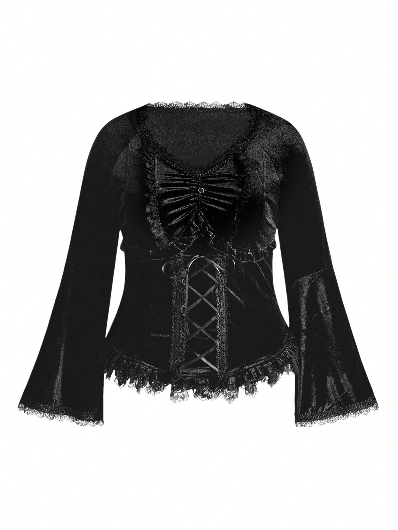 Plus Size Women Gothic Vintage Palace Luxurious Black Velvet Lace Ruffle Elegant Blouse, Autumn/Winter