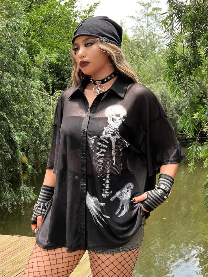 Plus Skeleton Print Drop Shoulder Mesh Shirt Without Tube Top, School For Summer
