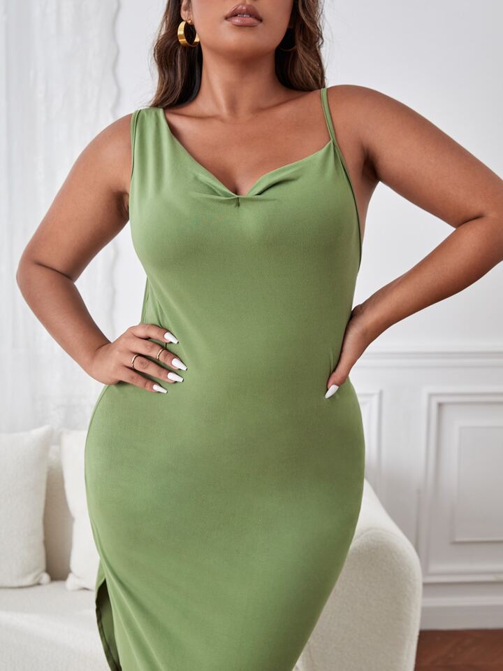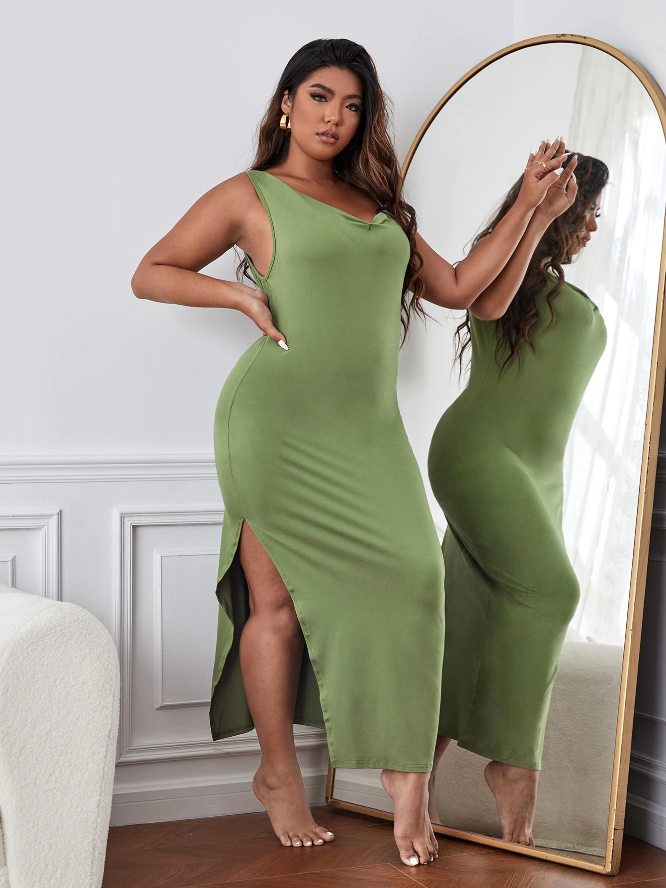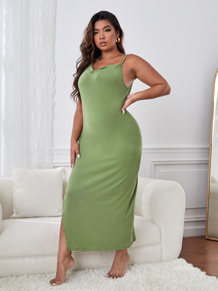 Plus Slit Thigh Ruched Asymmetrical Neck Nightdress