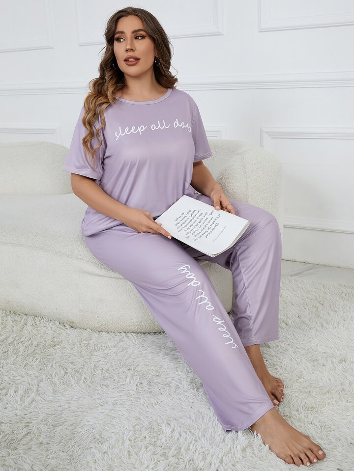 Plus Slogan Graphic Bow Front Tee & Pants Pajama Set