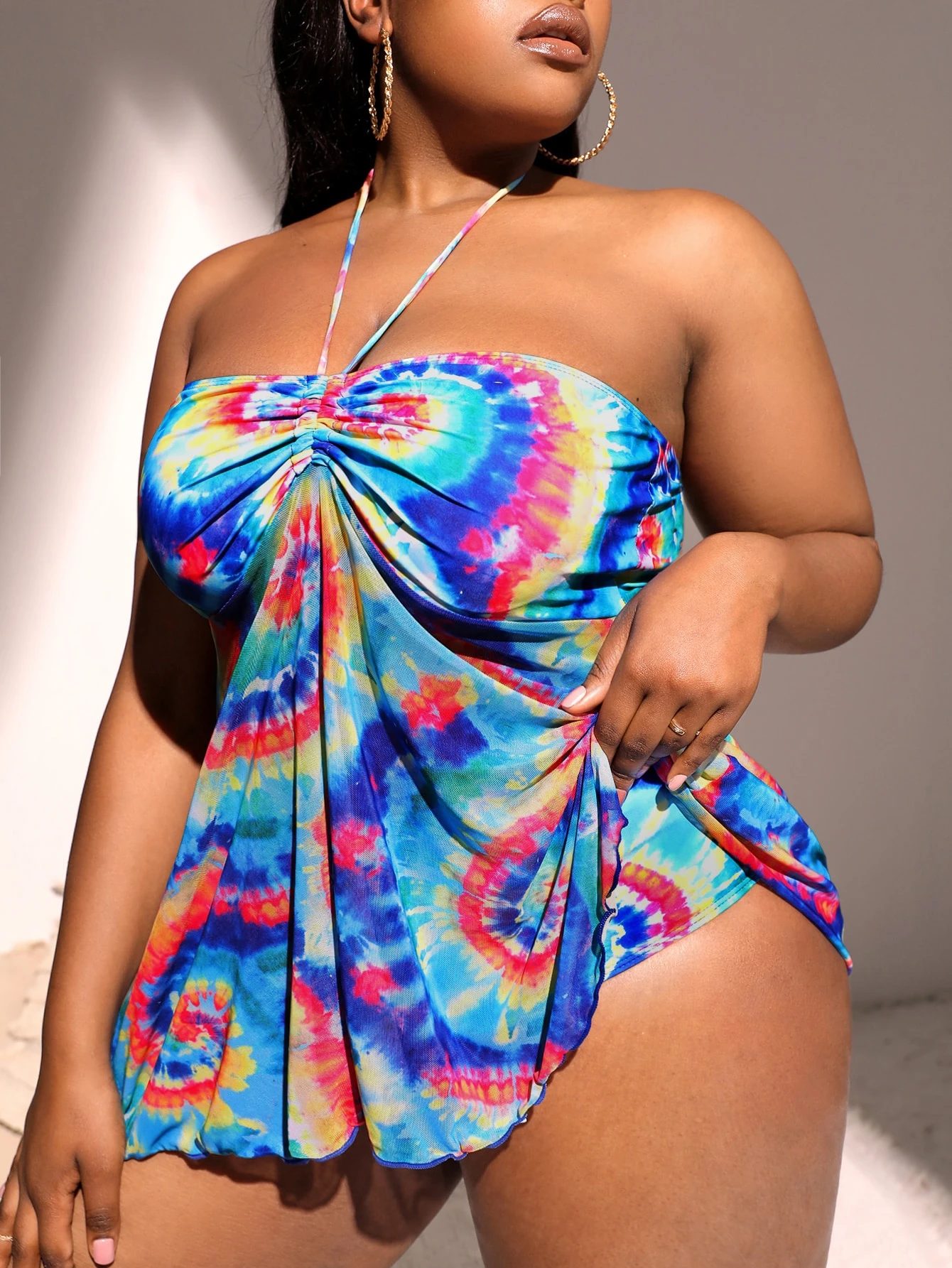 Plus Tie Dye Tankini Set Drawstring Halterneck Top & Swim Bottom 2 Piece Bathing Suit